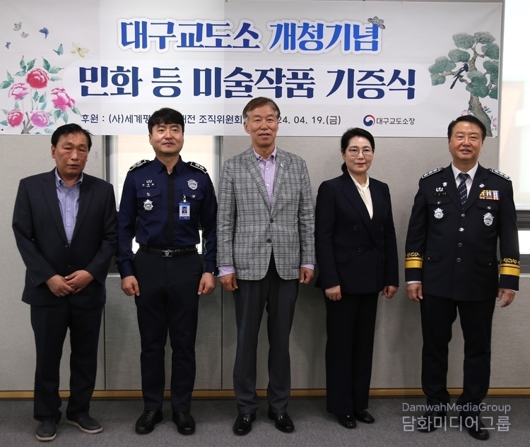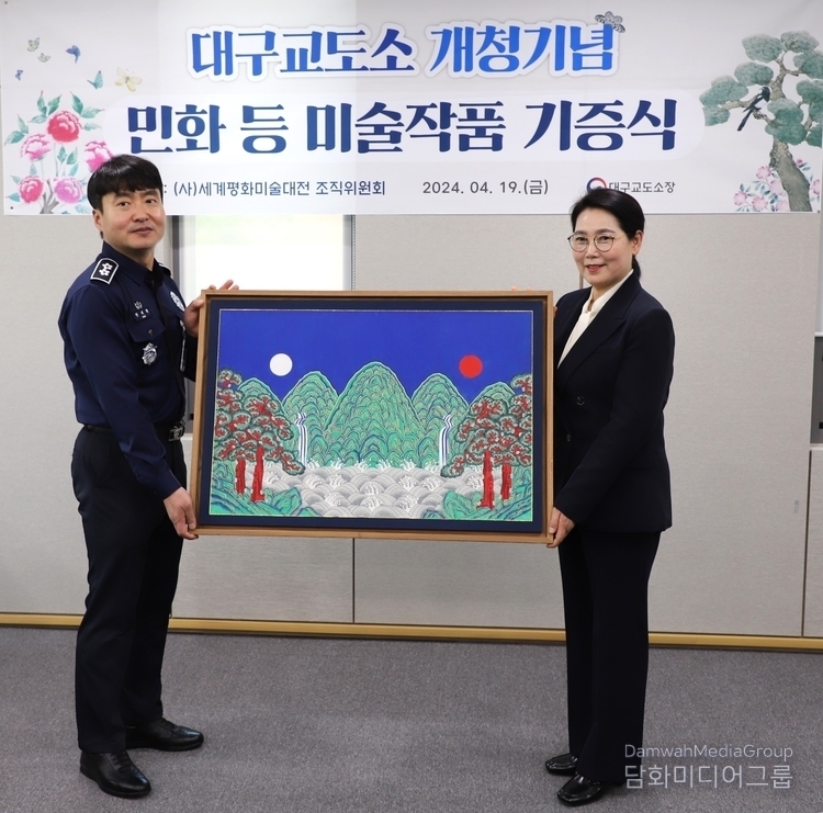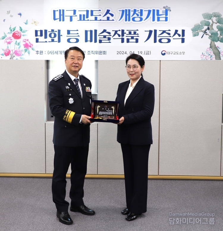 K-민화 이존영 기자 | 대구교도소는 19일 사단법인 세계평화미술대전 조직위원회(이사장 이존영)은 미술작품에 대한 기증식을 김동현 대구교정청장과, 한태환 대구교도소장, 이미형 명지대 문화콘텐즈·K민화 주임교수, 강석원 KS화랑 대표등이 참석한 가운데 민화를 비롯환 미술작품 30여점을 기증했다.