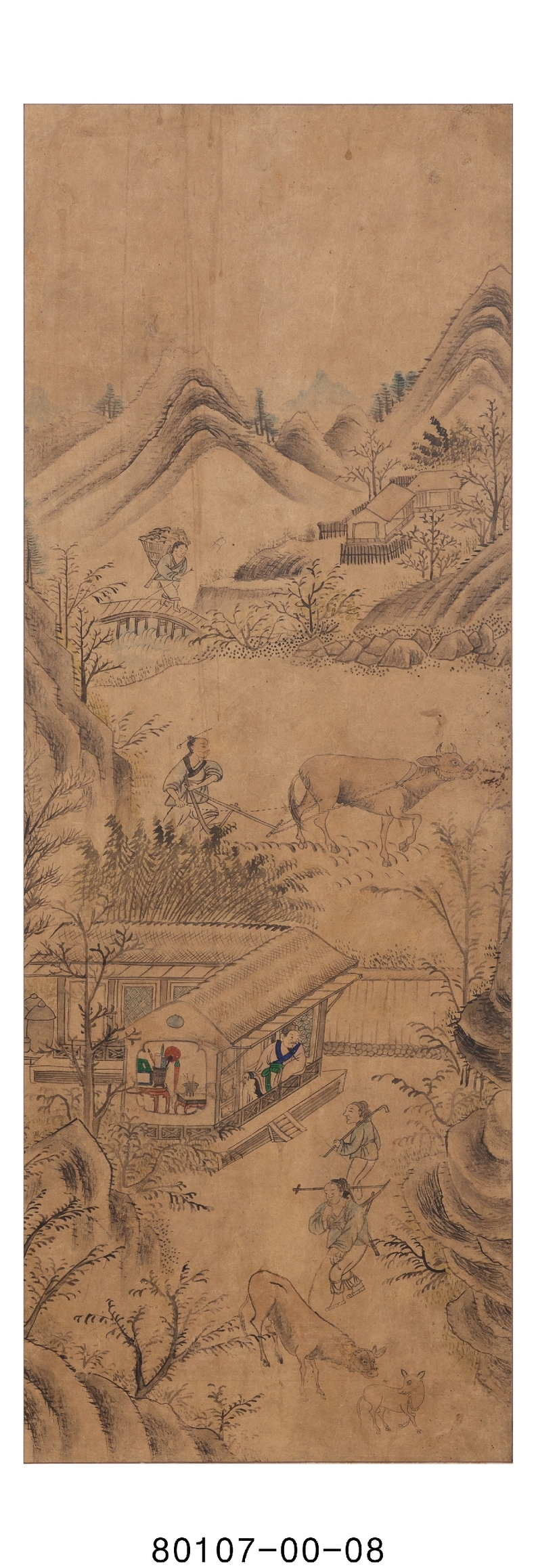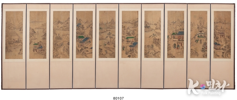 K-민화 이존영 기자 | 소장품설명고사(故事)에 등장하는 인물과 배경을 그린 10폭 병풍. 지본채색(紙本彩色). 화폭(세로 93.5 가로 32.8). 각 폭마다 산수를 배경으로 밭 가는 사람, 말 타는 사람 등이 묘사됨. 화면 주위는 비단으로 장황(裝潢)됨. 나무틀 상하단 모서리에 장석(裝錫)이 부착됨. 1폭 뒷면 좌측 상단에 '民畵十曲屛風'이 묵서된 제첨(題簽)이 붙어 있음. (접힌 크기 : 두께 6.5, 세로 169.2, 가로 47.3).