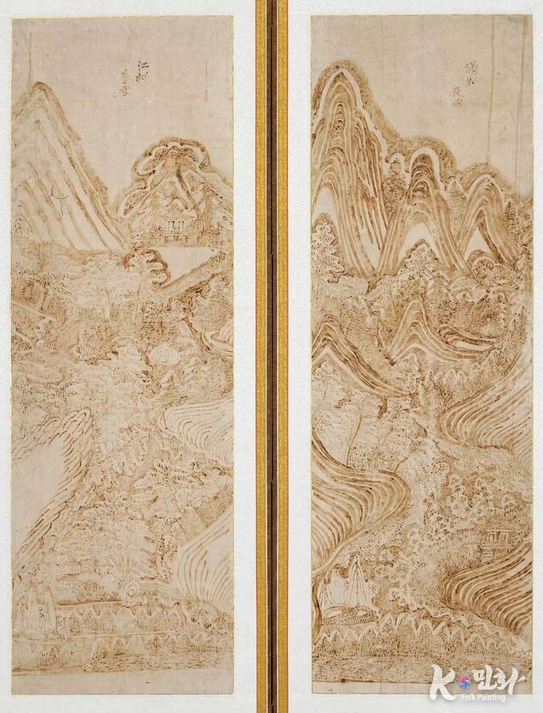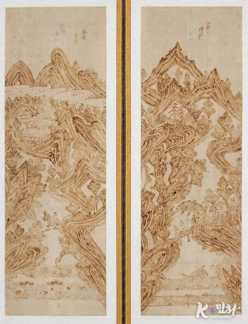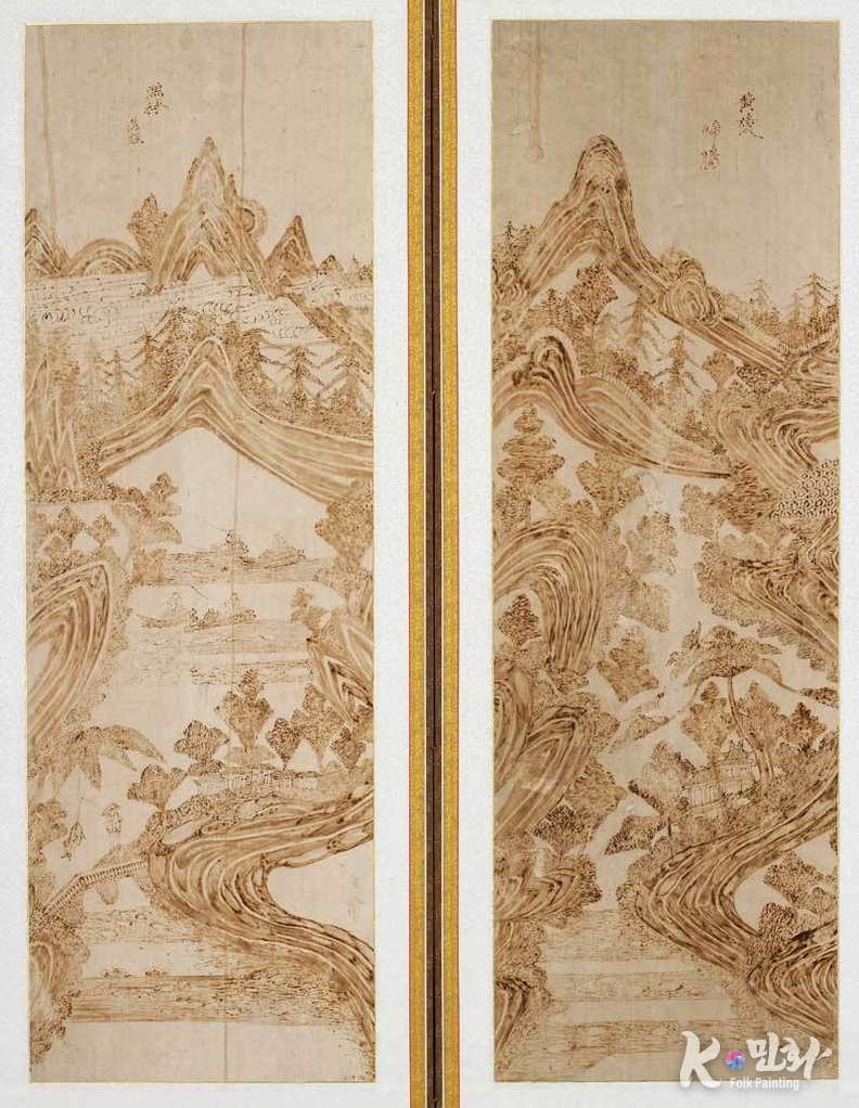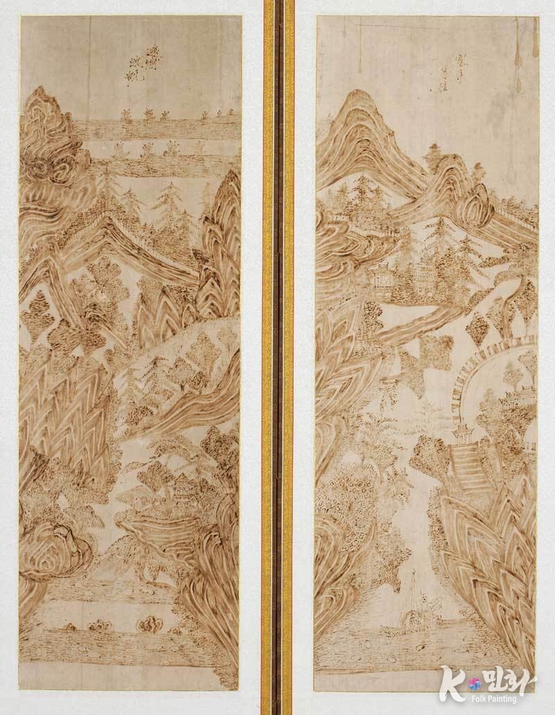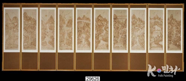 K-민화 이성준 기자 | 중국 후난성[湖南省]의 소상강(瀟湘江) 주변의 경치를 인두를 달구어 그린 그림. 지본낙화(紙本烙畵). 10폭 병풍(세로 166.5, 가로 440.8). 소상강의 아름다운 여덟 경치를 그린 소상팔경에 두 가지 경치를 더하여 10폭으로 그림. 자유분방하게 표현된 능선 등의 산수(山水)가 화면 전체에 꽉차게 표현됨.