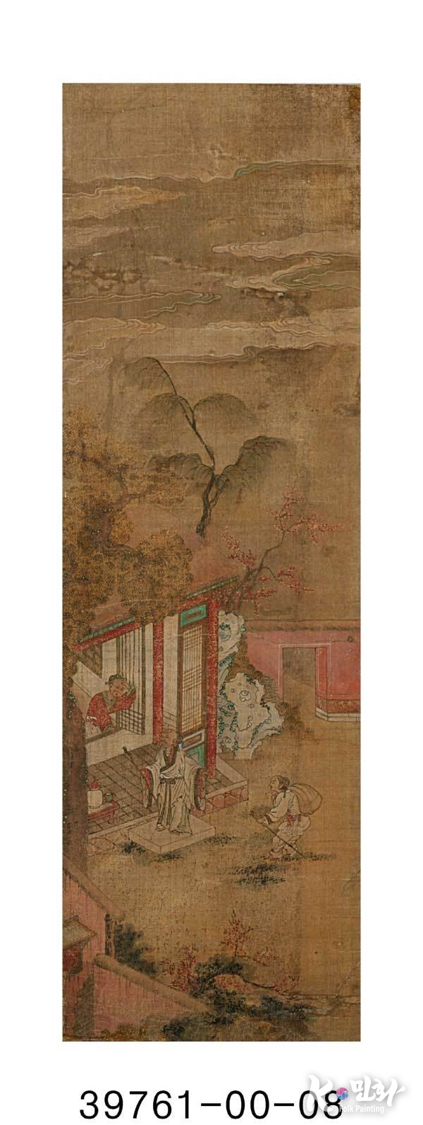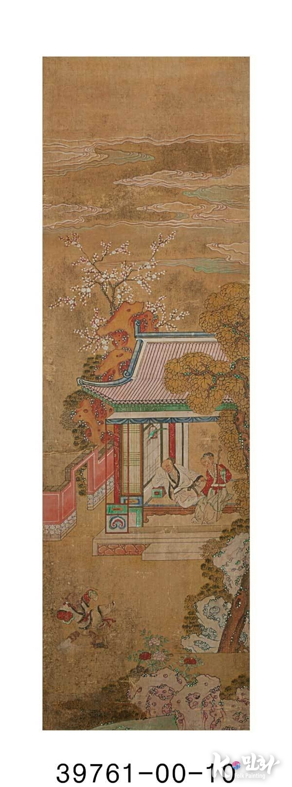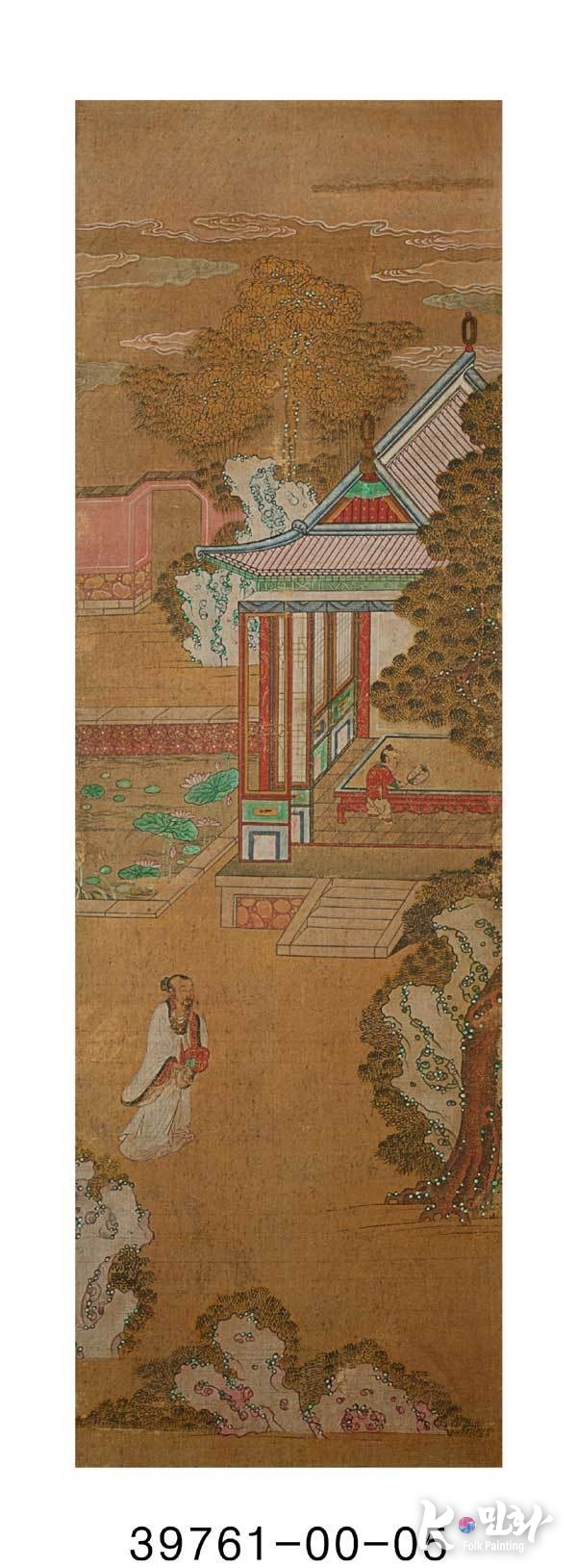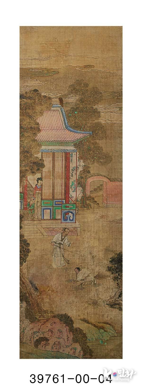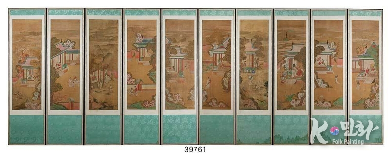 K-민화 이성준 기자 | 효자들의 효행과 관련된 내용을 그린 10폭 병풍. 저본채색(苧本彩色). 화폭(세로 120, 가로 38). 5폭씩 2개로 분리됨. (접힌 크기 : 세로 184, 가로 49, 두께 15).