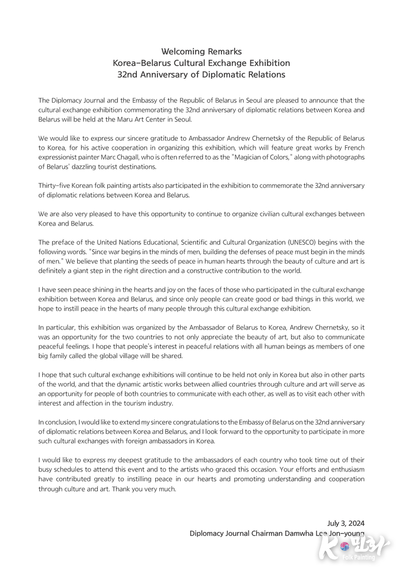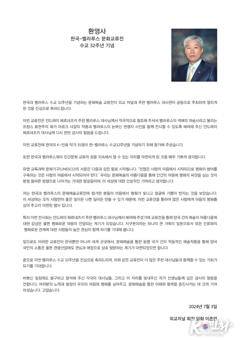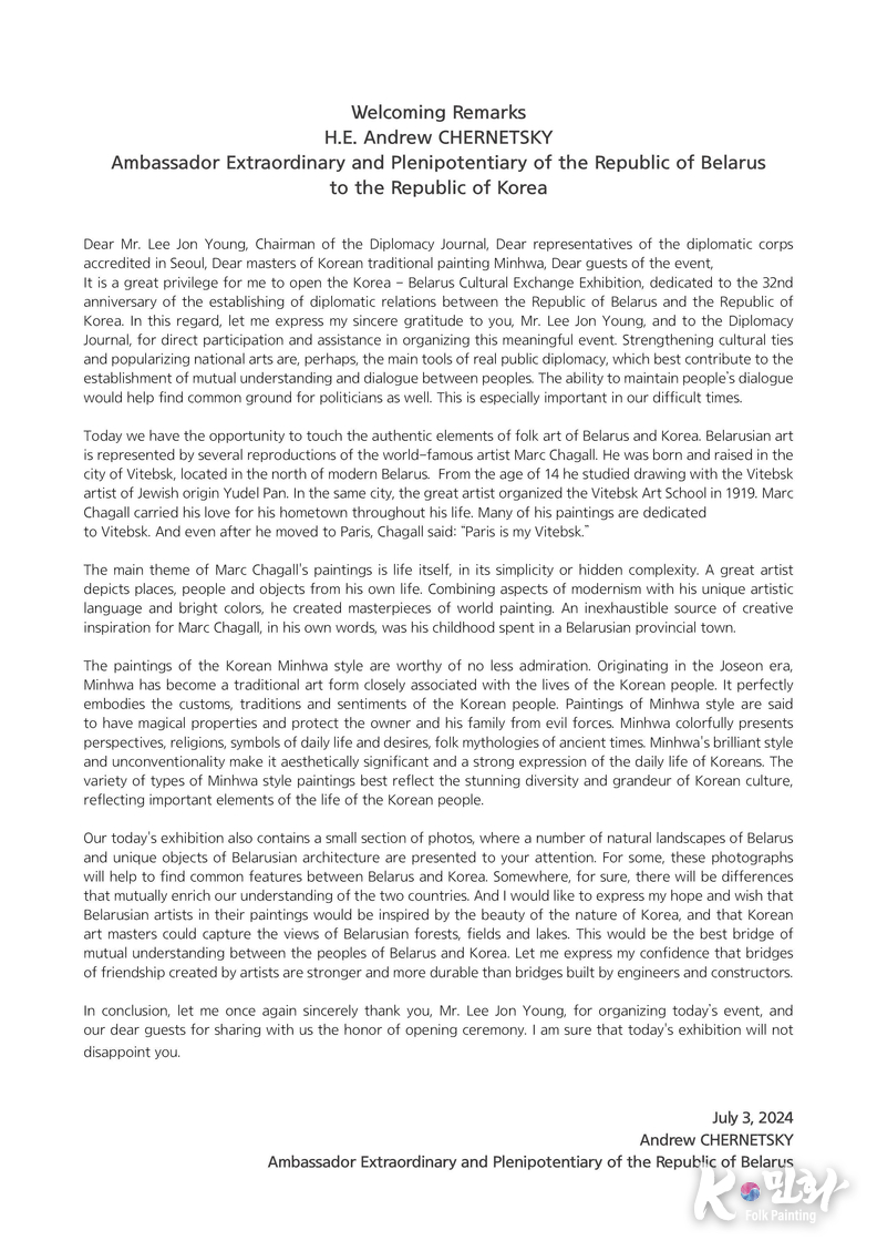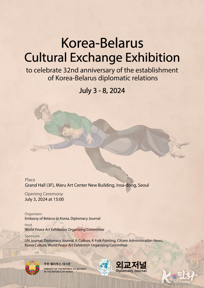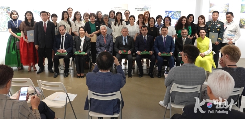 K-민화 관리자 장규호 기자 | 한국 벨라루스 수교 32주년을 기념, 외교저널과 UN 저널은 주한 벨라루스 대사관과 공동으로 개최한 문화교류 행사가 지난 3일 주한 외국대사, 러시아대사 지오르기 지노비옙, 아제르바이잔 대리대사 예민 테이무롭, 카자흐스탄 대사 누르갈리 아리스타놉, 키르기즈 공화국 대사 아이다 이스마일로바, 파키스탄 대사 나빌 무니르, 투르크메니스탄 대사 데겐치 두르디예브 등 100여명이 참석한 가운데 성황리에 열렸다.