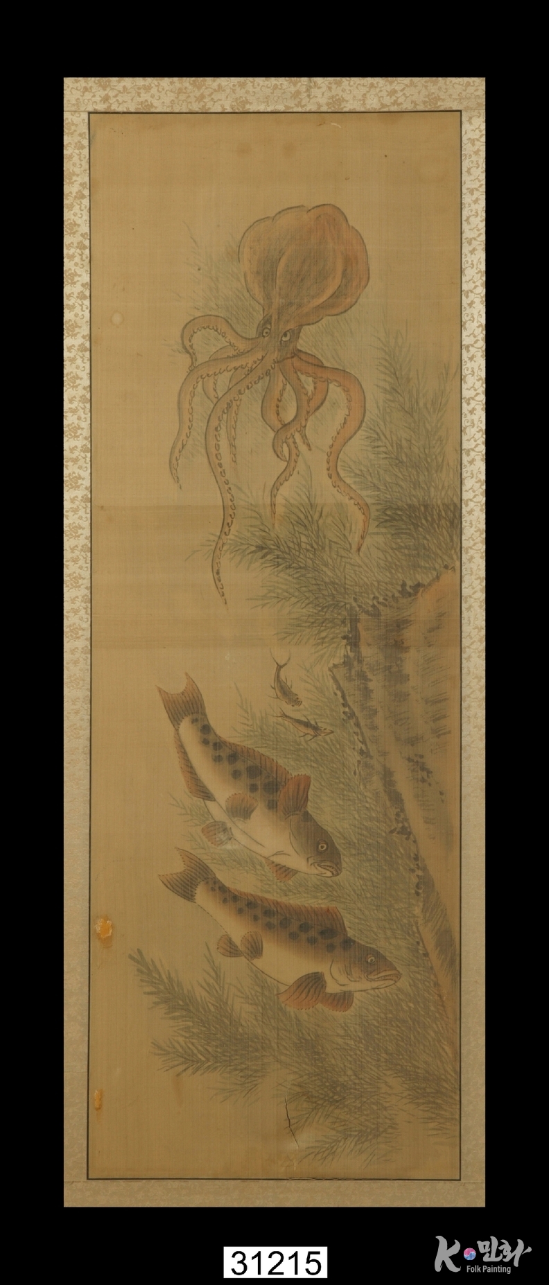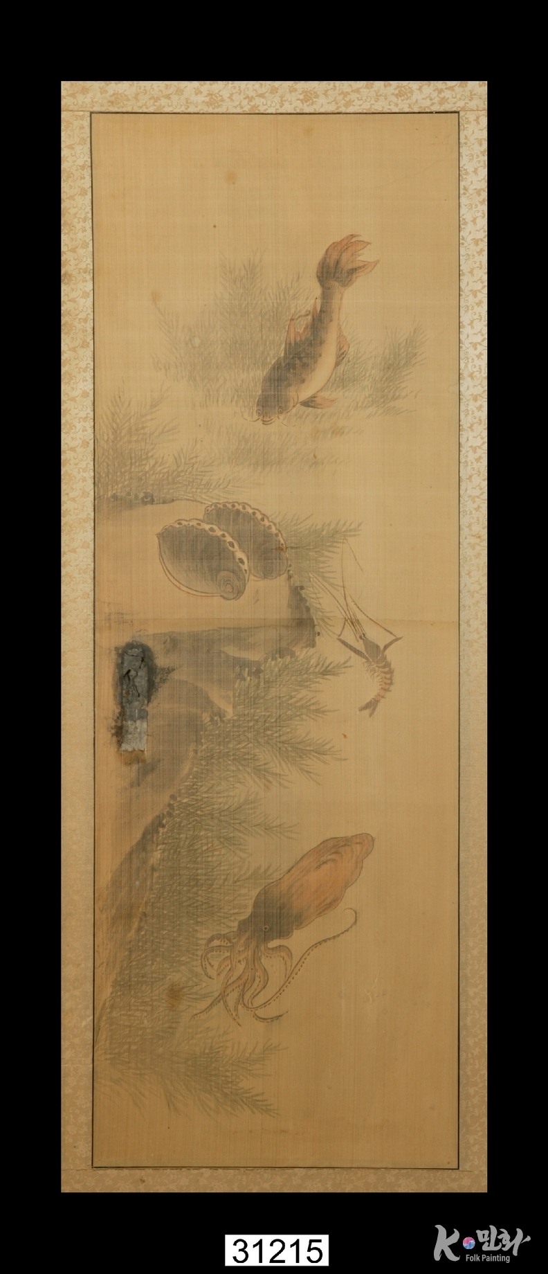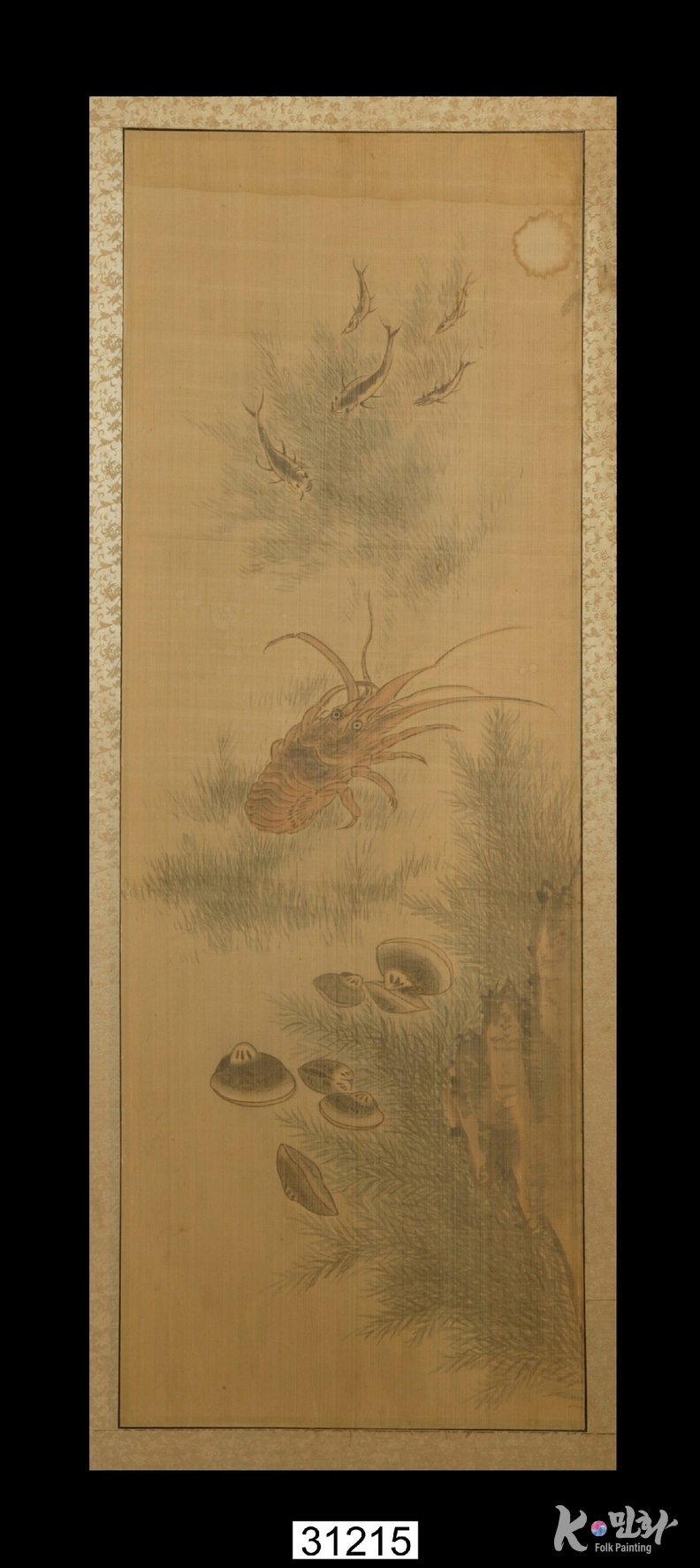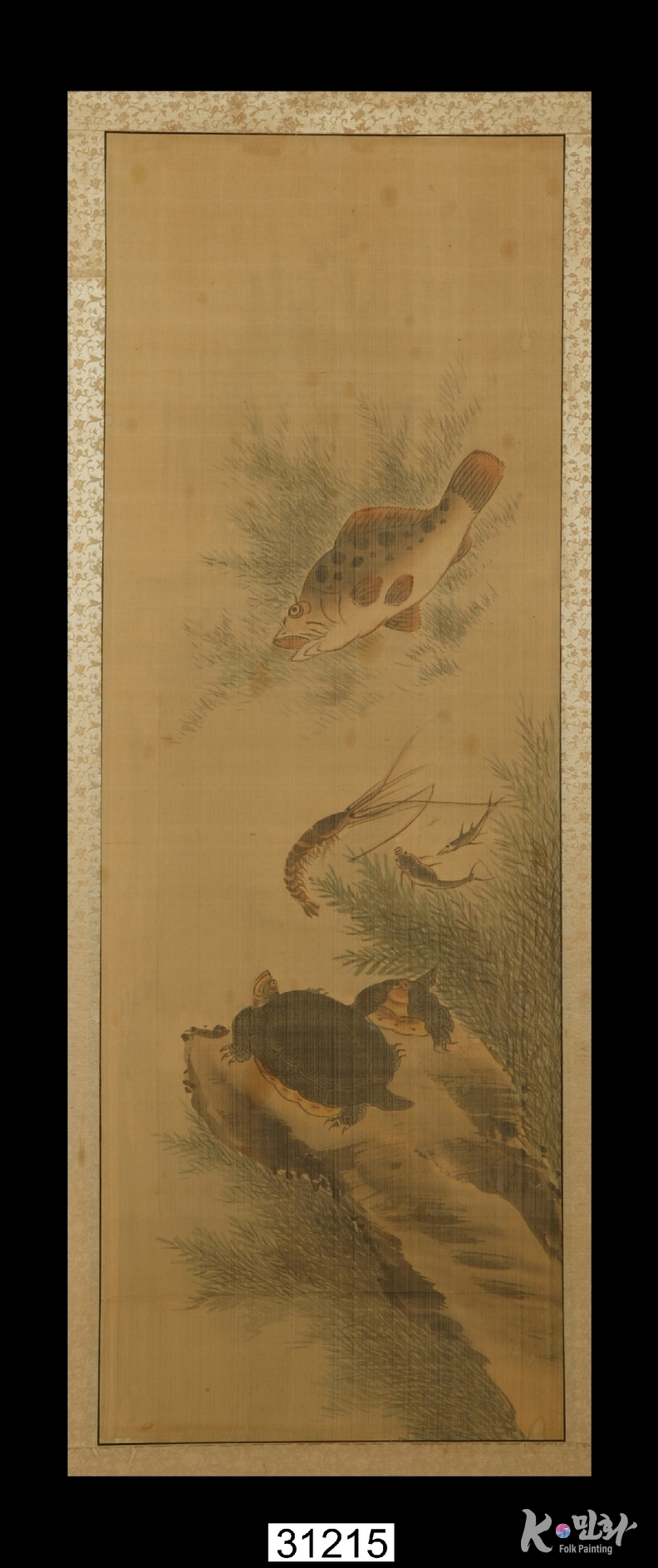 K-민화 이성준 기자 | 물고기나 게와 같은 물에 사는 동물을 그린 그림으로 꾸민 6폭 병풍(한 폭 크기: 세로 95, 가로 33). 견본채색(絹本彩色). 각 폭마다 바위와 수풀을 배경으로 잉어ㆍ숭어ㆍ자라ㆍ메기ㆍ새우ㆍ조개ㆍ문어 등이 그려짐. 먹으로 윤곽선을 그리고 채색함. 수풀과 바위, 물고기 등에 음영을 넣어 입체적으로 표현함.