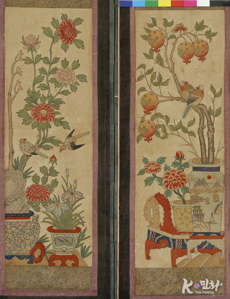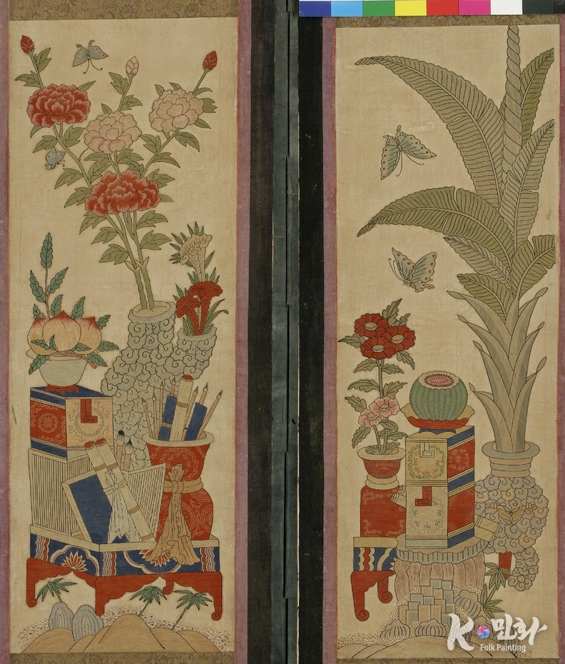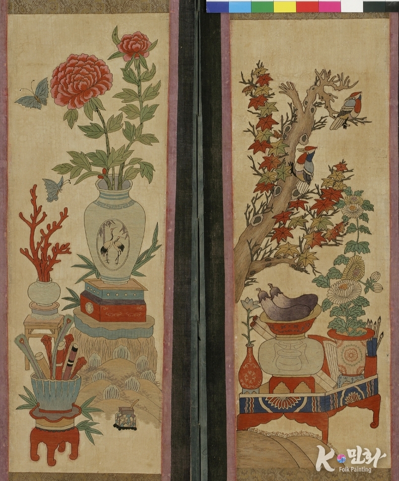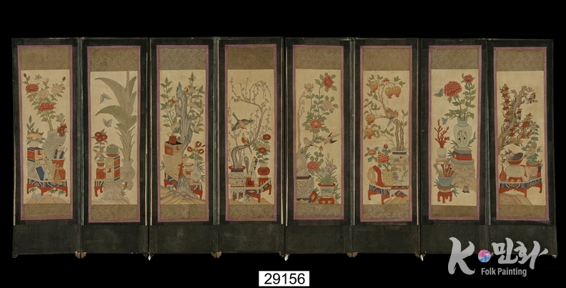 K-민화 이성준 기자 | 책ㆍ문방제구 등과 함께 화병에 꽂은 꽃나무 등을 그린 그림. 견본자수(絹本刺繡). 8폭 병풍(세로 127, 가로 320). 각 폭마다 모란과 붓 등을 기본으로 두고, 매화, 난, 연꽃, 석류, 파초, 단풍 등의 식물과 붓통, 두루마리, 가지, 수박, 불로초, 산호, 복숭아 등의 길상(吉祥) · 장수(長壽) 상징물들이 각각 조화롭게 배치됨. 붉은색과 청색 등을 기본으로 하여 다채롭고 뚜렷한 색채로 수가 놓여짐. 뒷면에는 6폭에 걸쳐 인쇄된 산수도(山水圖)가 배접되어 있음.