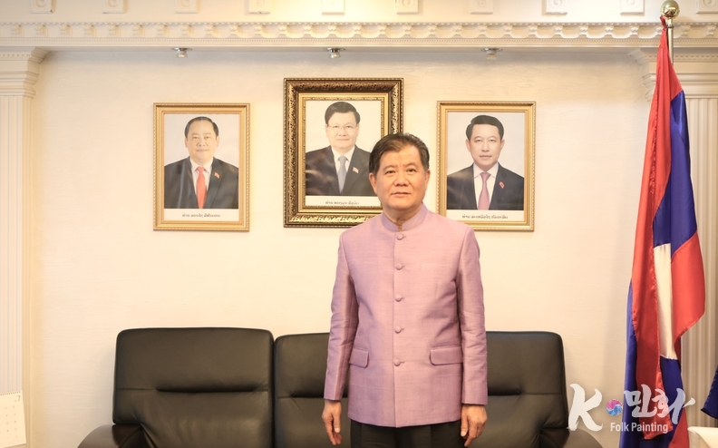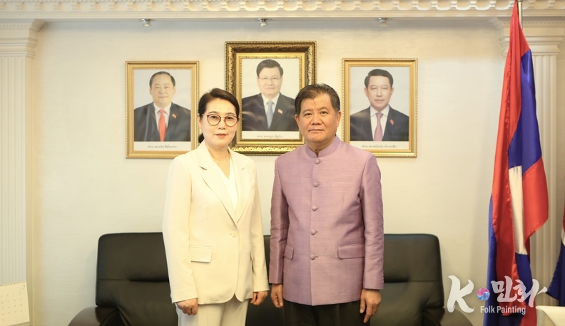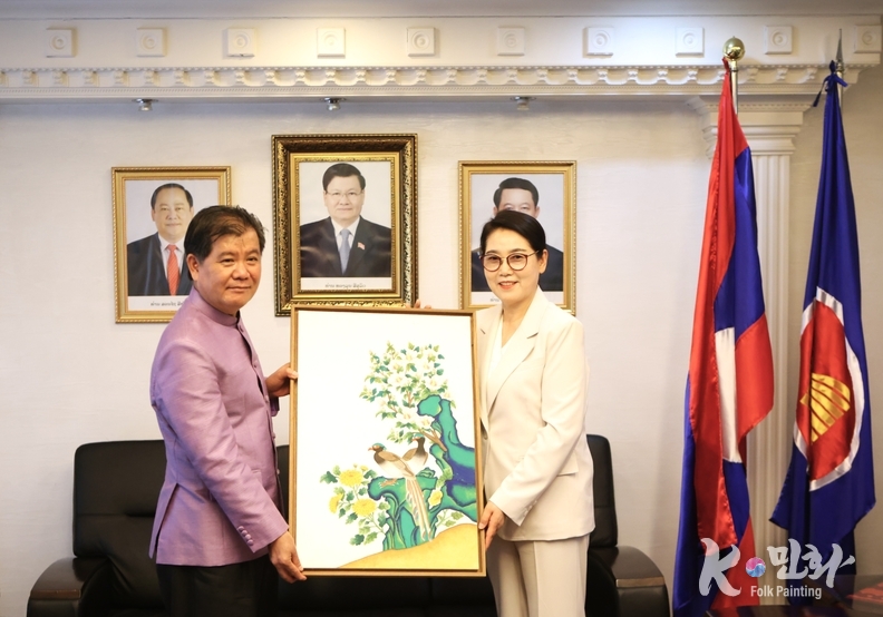 K-민화 관리자 기자 | 명지대학교 K-민화학과 이미형 주임교수가 주한 라오스 쏭깐 루앙턴 대사에게 민화작품을 기증했다.