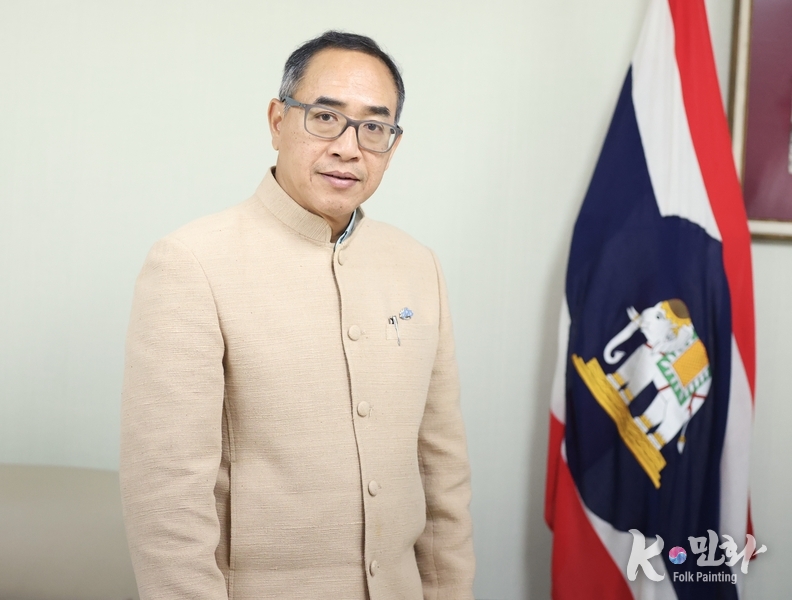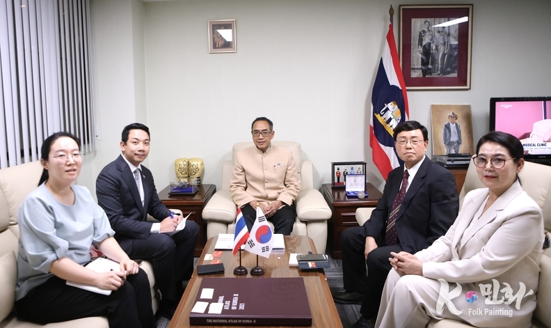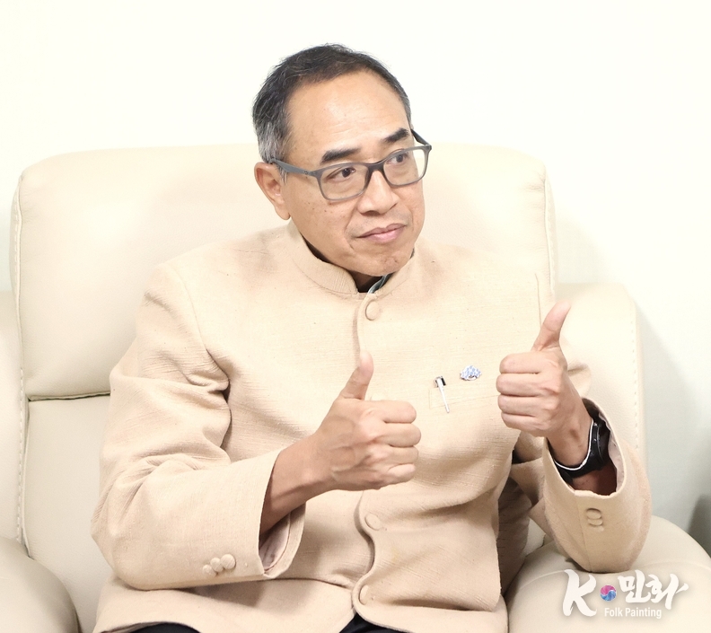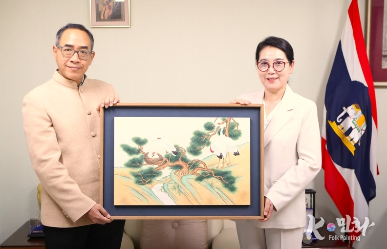 K-민화 관리자 기자 | 명지대학교 K-민화학과 이미형 주임교수가 타니 쌩랏 태국대사에게 민화작품을 기증했다. 이교수는 주한 외국 대사관에 16번째 한국의 K-민화를 기증 했다.