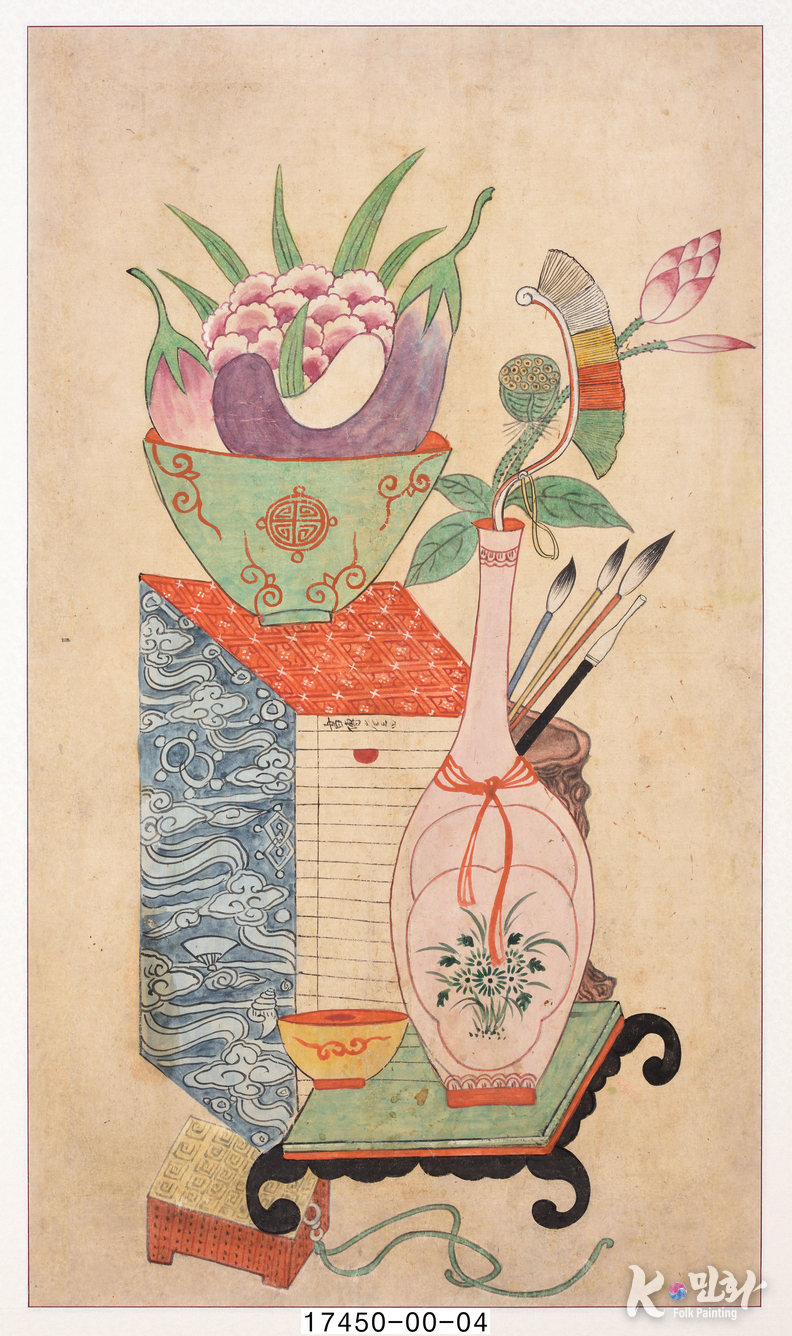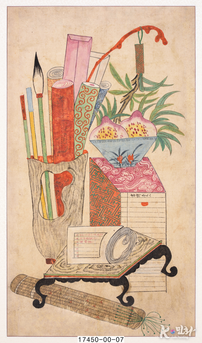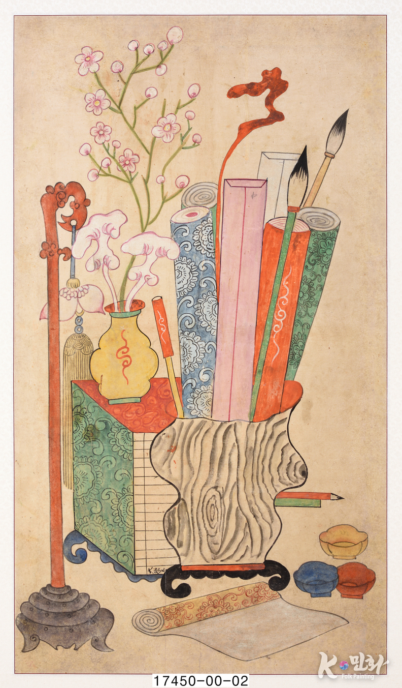K-민화 이성준 기자 | 지본채색(紙本彩色). 화병, 두루마리지, 붓, 책 등 문방구와 소나무, 괴석, 모란, 석류 등이 어우러진 그림. 화폭(세로 65.5, 가로 37.5).