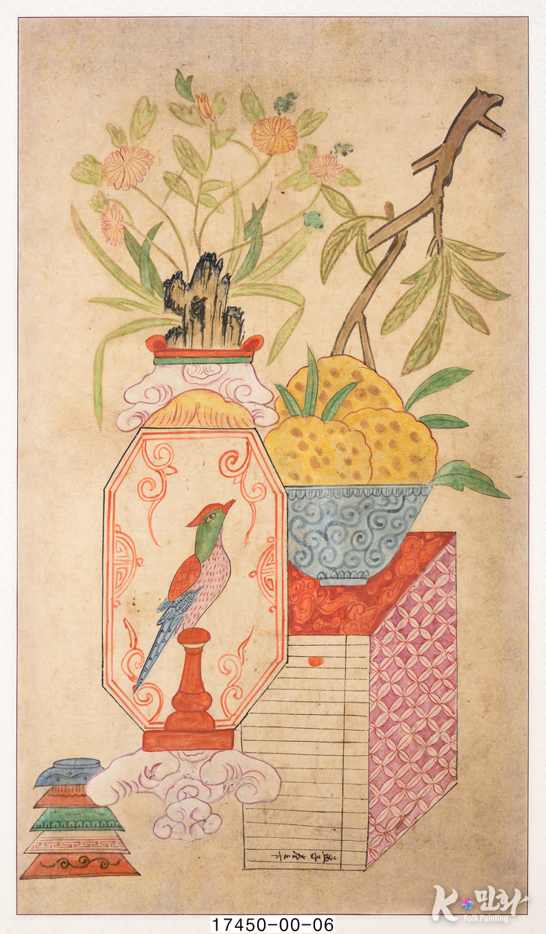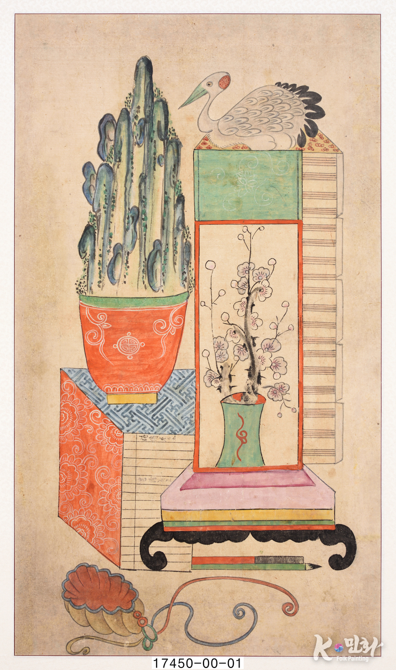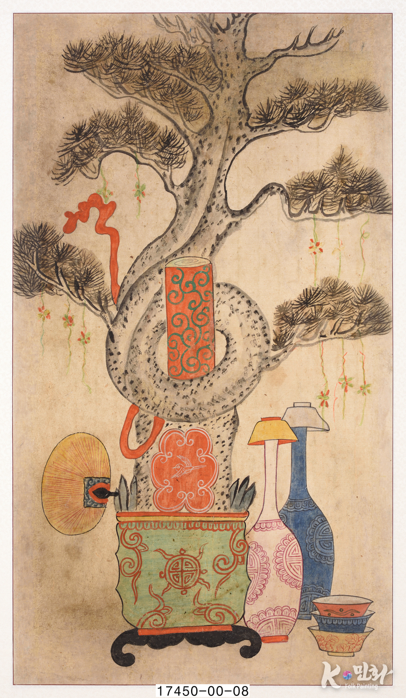 K-민화 이성준 기자 | 지본채색(紙本彩色). 화병, 두루마리지, 붓, 책 등 문방구와 소나무, 괴석, 모란, 석류 등이 어우러진 그림. 화폭(세로 65.5, 가로 37.5).