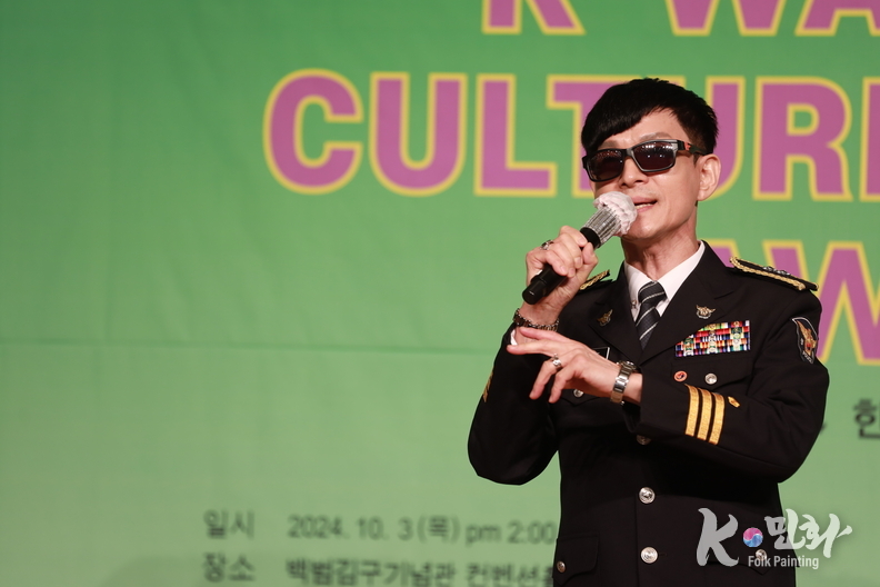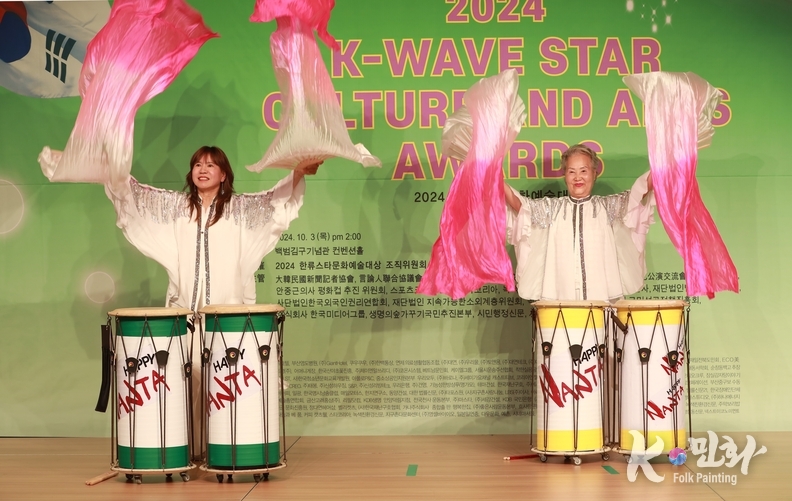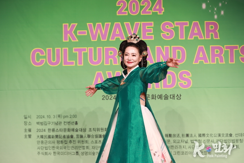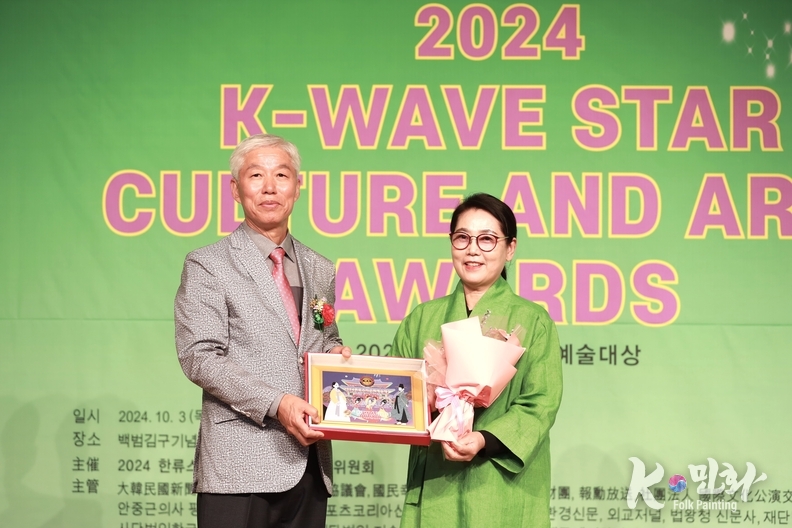 K-민화 이성준 기자 | 명지대학교 문화콘텐츠학과 K-민화 주임교수이자 K-민화연구소장인 이미형 교수가 2024년 10월 3일 오후 2시 백범기념관에서 열린 2024 한류스타문화예술대상 시상식에서 '2024 K-민화 최우수 작가 대상' 수상했다.