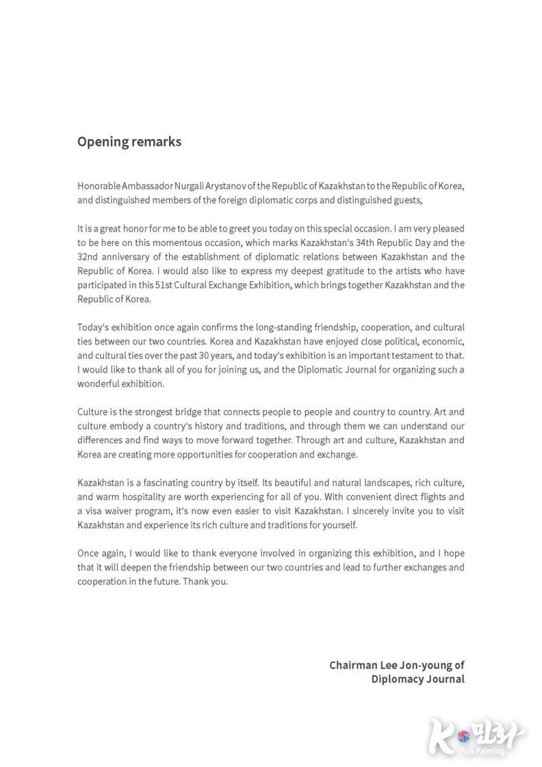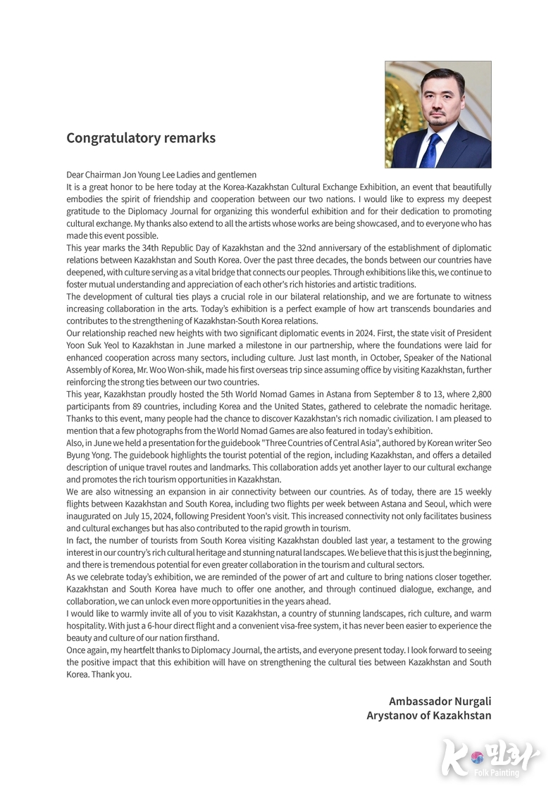 이번 행사는 누르갈리 아르스타노프(Nurgali Arystanov) 주한 카자흐스탄 대사와 외교저널 이존영 회장이 공동 주최하며, 다양한 외교관과 문화 예술계 인사들이 참석할 예정이다.