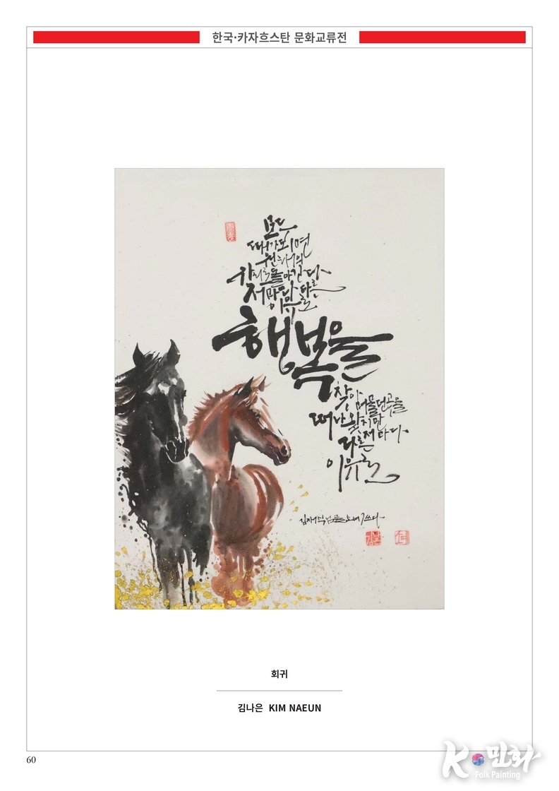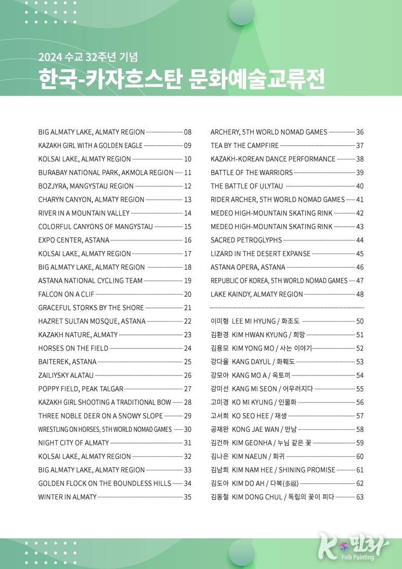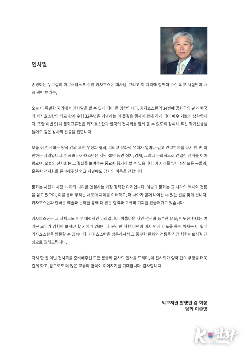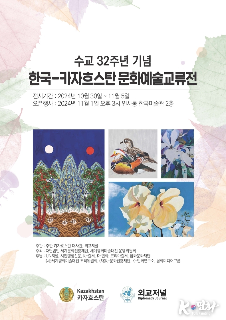 K-민화 이성준 기자 | 오는 10월 30일부터 11월 5일까지 서울 인사동 한국미술관 2층에서 제51차 문화예술교류전이 열린다. 이번 전시는 한국과 카자흐스탄의 수교 32주년을 기념하며, 양국 간의 깊은 문화적 유대와 교류를 기념하는 자리이다. 전시에는 한국과 카자흐스탄의 예술가들이 참여하여 다양한 작품들을 선보일 예정이다.