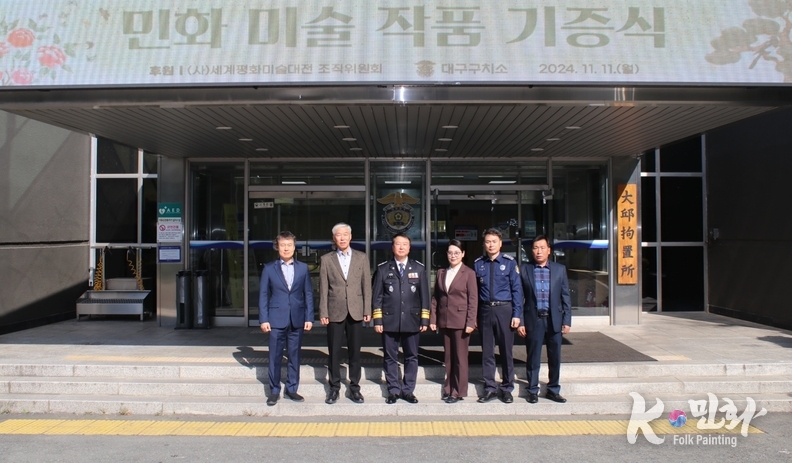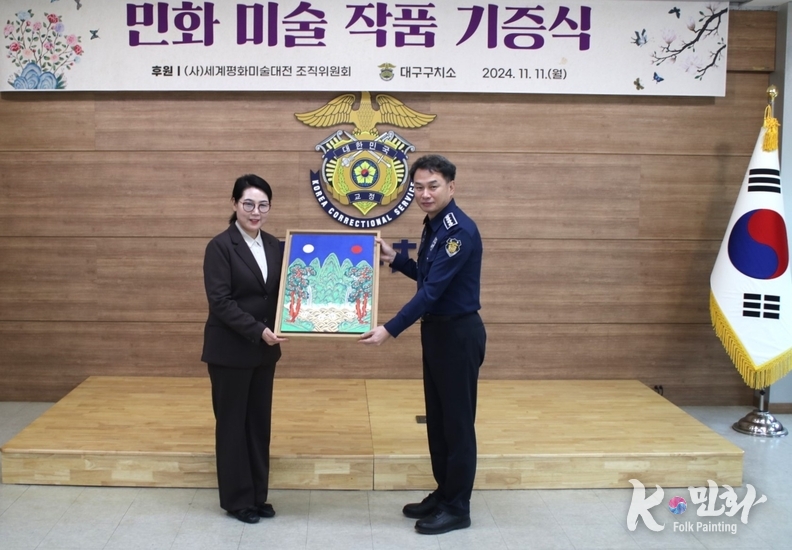 K-민화 이성준 기자 | 대구 구치소(소장 김영광)는 11일, 사단법인 세계평화미술대전 조직위원회(이사장 이존영)로부터 15점의 미술작품 기증식을 진행했다. 이번 행사는 세계평화미술대전 조직위원회가 수용자들의 심리적 안정과 교정교화를 돕기 위해 미술작품을 기증하고자 하는 이존영 이사장의 제안에 따라 이뤄졌다.