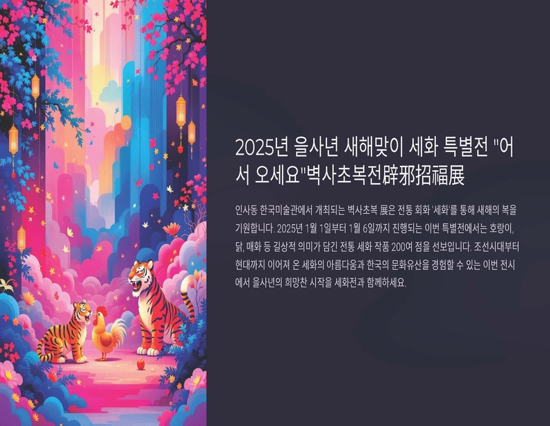 K-민화 이성준 기자 | 2025년 1월 1일부터 6일까지 인사동 한국미술관 2층(전관)에서 2025乙巳년 새해맞이 세화歲畵 특별전 "어서 오세요"가 열린다. 이번 전시는 월간 K-민화와 재단법인 K-문화진흥재단이 주최하며, K-민화연구소, 외교저널이 공동으로 주관한다.