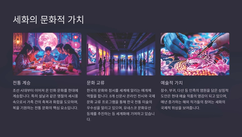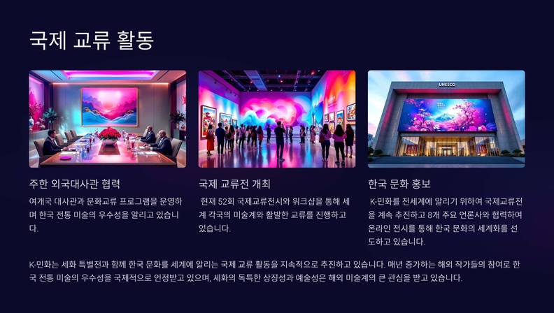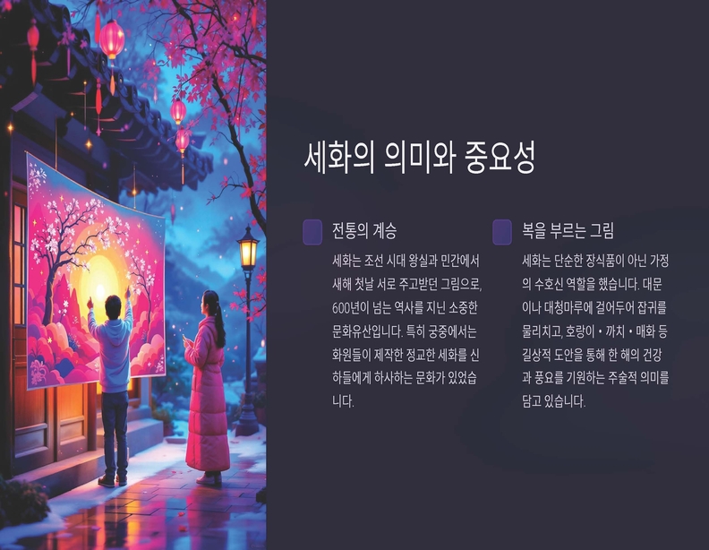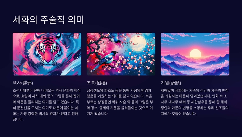담화 K-민화 이존영 발행인은 “세화는 ‘벽사초복辟邪招福’ 즉, 악을 물리치고 복을 기원하는 전통적인 그림으로, 이번 전시를 통해 한국의 K-민화를 세계에 널리 알리고 국제 교류를 강화하고자 한다”고 전했다. 또한 주한 외국 대사관과 협력하여 K-민화를 매개로 한 국제 교류전을 꾸준히 이어갈 계획을 밝혔다.