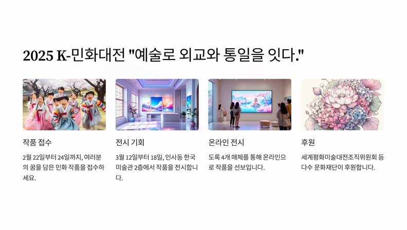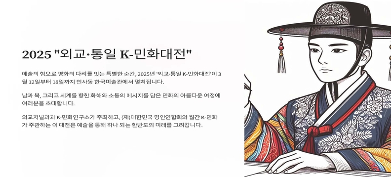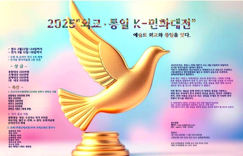 K-민화 김학영 기자 | 2025년‘외교·통일 k-민화 대전’이 오는 3월 12일부터 18일까지 인사동 한국미술관 2층 전관에서 열린다. 이번 K-민화대전은 외교저널과 K-민화연구소가 공동 주최하고, (재)대한민국 명인연합회와 월간 K-민화가 공동으로 주관하고 담화문화재단이 협찬한다.