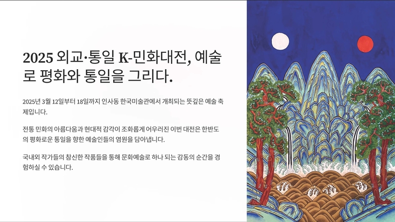 K-민화 이성준 기자 | 오는 3월 12일부터 18일까지 인사동 한국미술관 2층에서 열리는 ‘2025 외교·통일 K-민화대전’은 전통과 현대가 어우러진 민화의 매력을 통해 한반도의 평화와 통일을 기원하는 특별한 예술의 장을 마련한다.