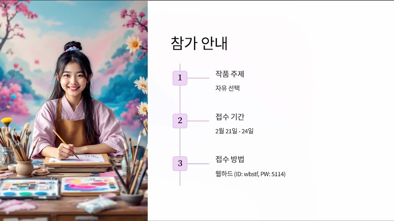 참가를 원하는 민화 작가들은 2월 21일부터 24일까지 웹하드(www.webhard.co.kr)를 통해 작품을 접수할 수 있다. (ID: wbstf, PW: 5114) 이번 대전을 통해 한반도의 평화와 통일을 염원하며, 예술을 통해 전 세계와 소통하는 기회를 가지게 될 것이다.