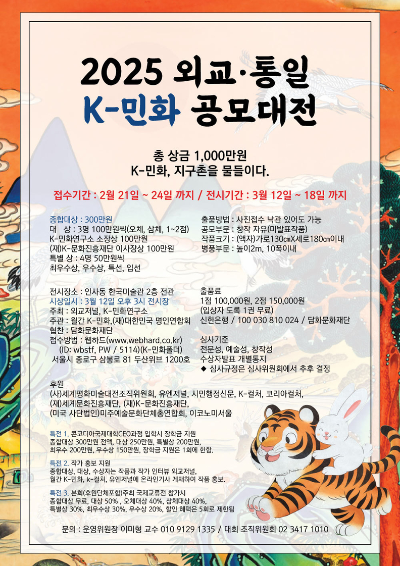 2025 외교·통일 K-민화대전은 전통과 현대, 그리고 예술을 통한 평화와 통일의 메시지를 전 세계로 확산시키는 중요한 행사로, 참여하는 K-민화 작가들에게 큰 영광의 기회를 안겨줄 것으로 보인다.
