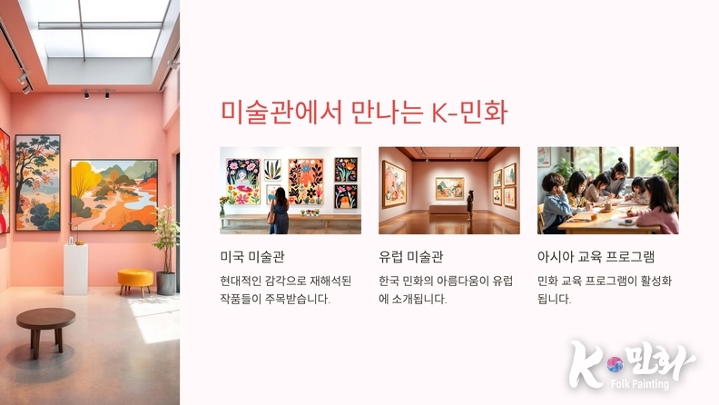 최근 K-민화연구소(이미형 소장)를 중심으로 한 다양한 프로젝트가 세계 각국에서 펼쳐지고 있다. 해외 박람회와 전시회를 통해 K-민화의 아름다움을 알리는 한편, 글로벌 브랜드와의 협업을 통해 패션, 인테리어, 디지털 콘텐츠 등 다양한 분야에서 민화의 가치가 확장되고 있다. 특히, 미국과 유럽의 미술관에서는 한국 민화를 현대적인 감각으로 재해석한 작품들이 큰 주목을 받고 있으며, 아시아 각국에서는 민화 교육 프로그램이 활성화되며 관심이 높아지고 있다.