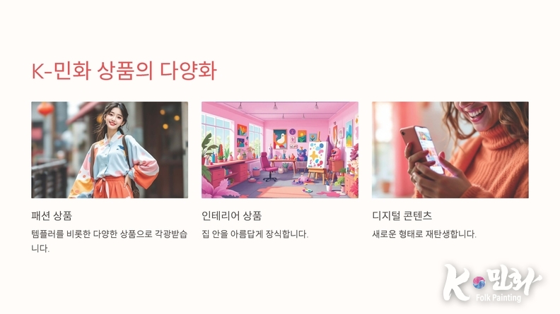 "K-민화가 지구촌을 물들이다!" K-컬처의 새로운 중심으로 떠오른 K-민화의 여정을 함께 지켜보자. 템플러를 비롯해서 각종 상품으로도 각광을 받고 있다.