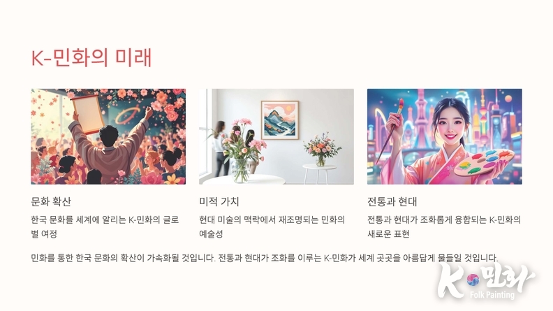 앞으로 민화를 통한 한국 문화의 확산이 더욱 가속화될 것으로 기대되며, 전통과 현대가 조화를 이루는 K-민화가 세계 곳곳을 아름답게 물들이는 날이 머지않았다.