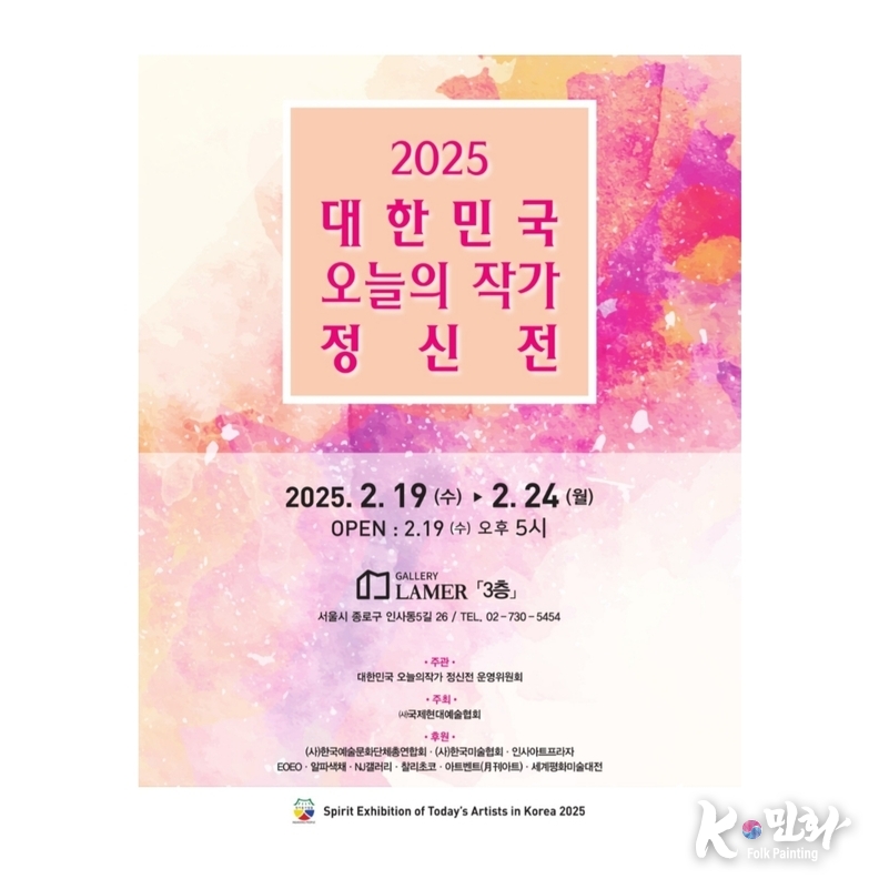 K-민화 이성준 기자 | 2025년 새해를 맞아 한국 미술계의 대표적인 행사인 ‘대한민국 오늘의 작가 정신전’이 2월 19일부터 24일까지 인사동 라메르 갤러리 3층에서 개최된다. 올해로 12회를 맞이한 본 전시는 국내 미술인들의 창작 정신과 예술적 가치를 조명하며, 다채로운 작품을 통해 한국 미술의 현재와 미래를 조망하는 뜻깊은 자리로 마련되었다.