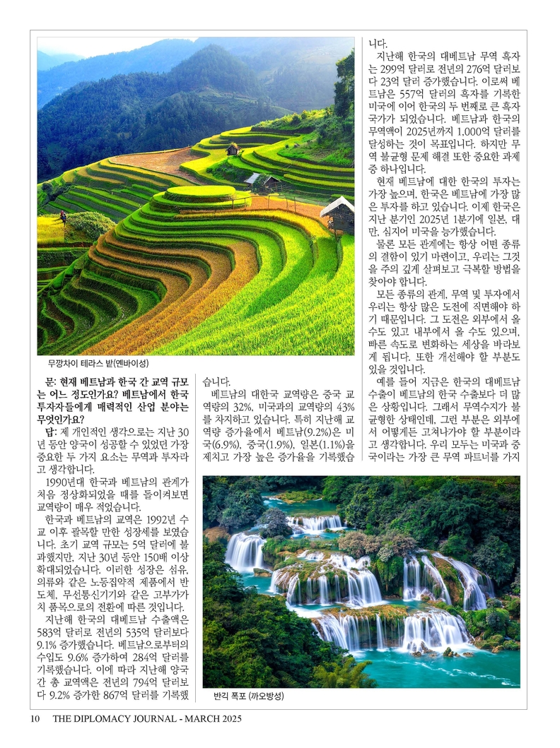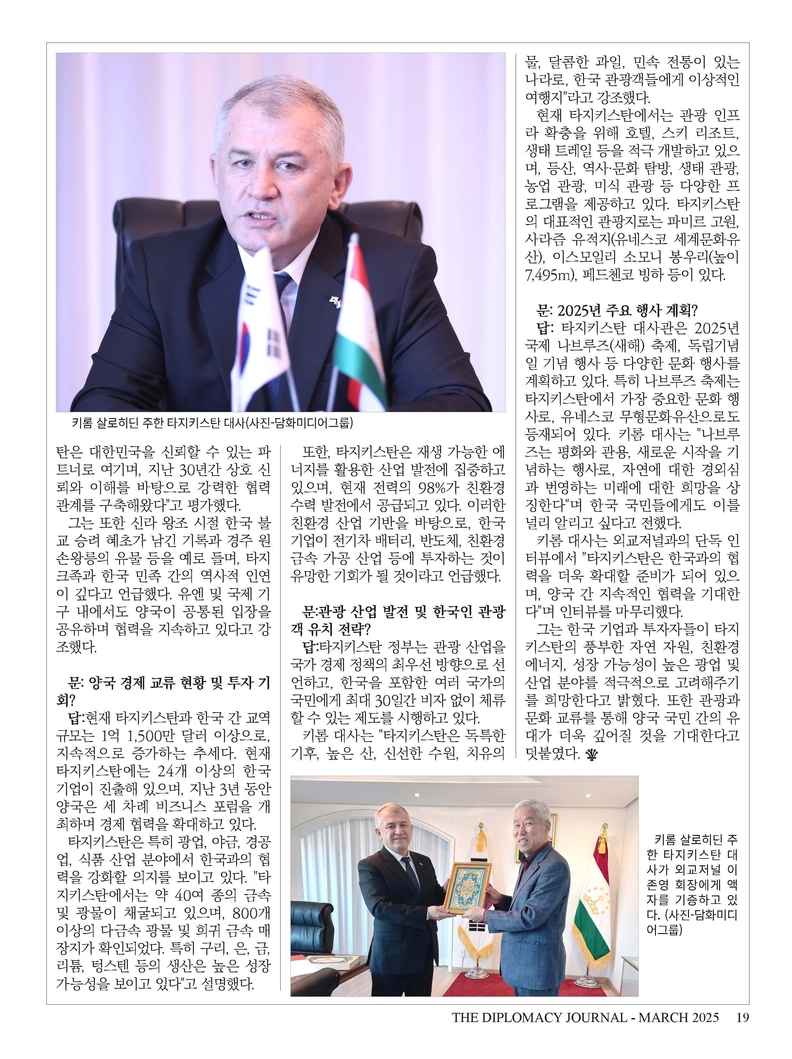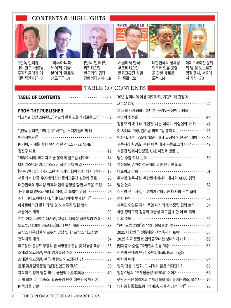 그동안 외교저널은 주한 외국 대사 인터뷰, 국제 외교 정책 분석, 경제 동향, 문화 교류 등 다양한 주제를 심층적으로 다루며 독자들에게 통찰력 있는 정보를 제공해 왔습니다. 특히 외교관과 정책 입안자들의 목소리를 담아 국가 간 외교 관계의 발전과 협력을 도모하는 데 기여해 왔습니다. 한국어판과 영문판을 통해 국내 독자들에게는 세계 각국의 외교·문화 정보를 제공하고, 해외 독자들에게는 대한민국의 외교적 입장과 국제 협력의 중요성을 전달하는 가교 역할을 수행하고 있습니다.