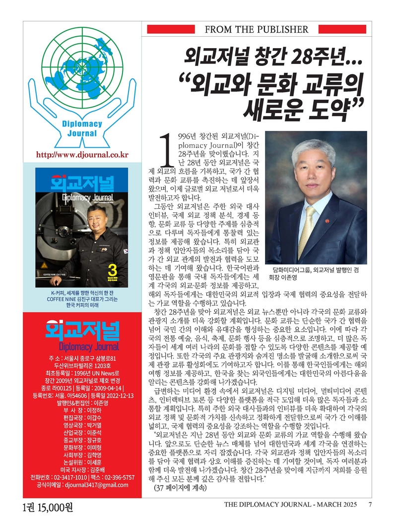 외교저널은 앞으로도 국익에 기여하는 외교·문화 교류의 중심지로서 역할을 다할 것입니다. 28년간 이어온 외교적 여정을 돌아보며 더 나은 미래를 향해 나아가겠습니다. 독자 여러분의 관심과 성원에 깊이 감사드리며, 더욱 깊이 있고 신뢰할 수 있는 콘텐츠를 제공할 것을 약속드립니다.