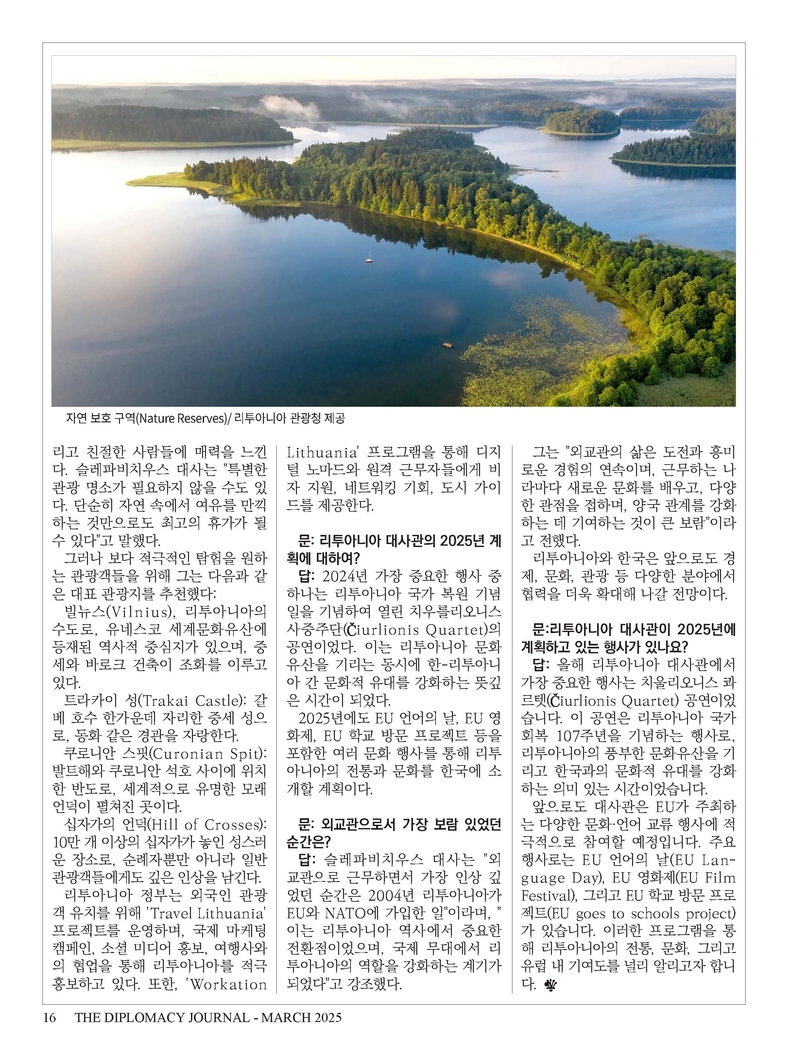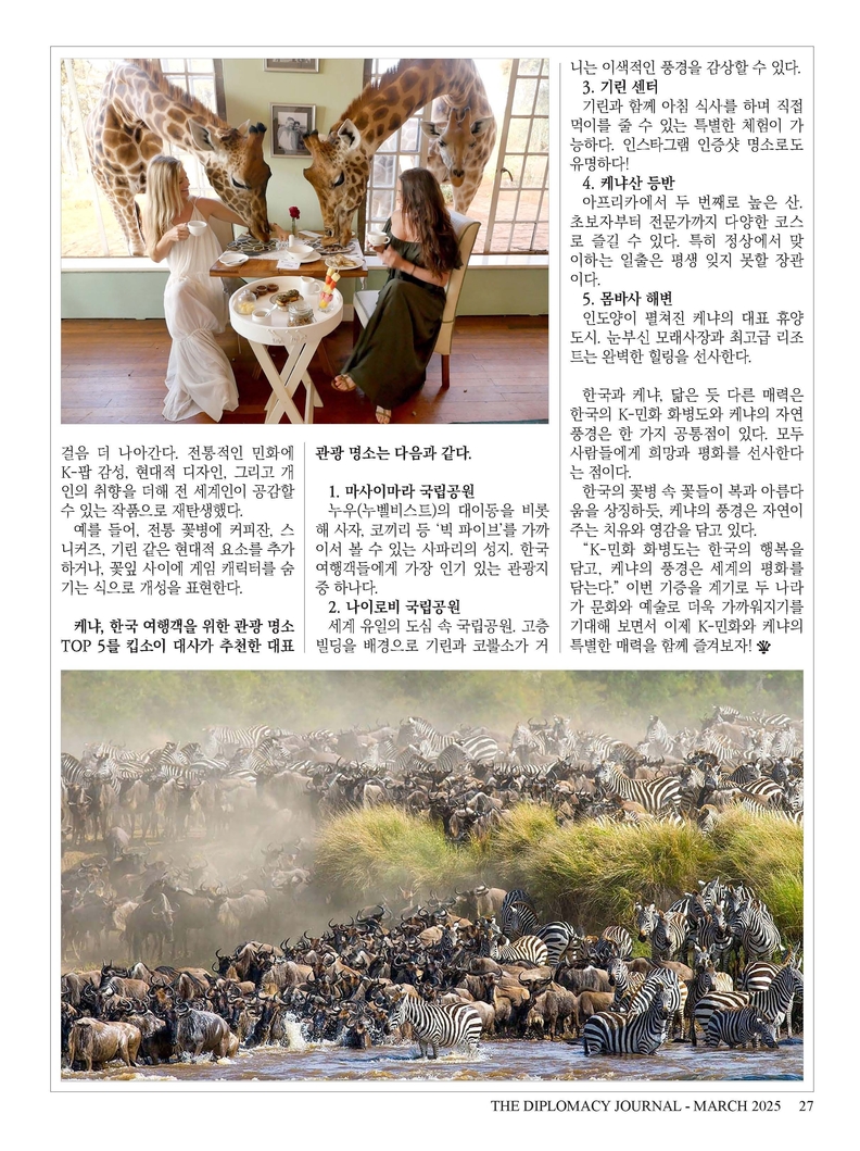 창간 28주년을 맞아 외교저널은 외교 뉴스뿐만 아니라 각국의 문화 교류와 관광지 소개를 더욱 강화할 계획입니다. 문화 교류는 단순한 국가 간 협력을 넘어 국민 간의 이해와 유대감을 형성하는 중요한 요소입니다. 이에 따라 각국의 전통 예술, 음식, 축제, 문화 행사 등을 심층적으로 조명하고, 더 많은 독자들이 세계 여러 나라의 문화를 접할 수 있도록 다양한 콘텐츠를 제공할 예정입니다. 또한 각국의 주요 관광지와 숨겨진 명소를 발굴해 소개함으로써 국제 관광 교류 활성화에도 기여하고자 합니다. 이를 통해 한국인들에게는 해외 여행 정보를 제공하고, 한국을 찾는 외국인들에게는 대한민국의 아름다움을 알리는 콘텐츠를 강화해 나가겠습니다.