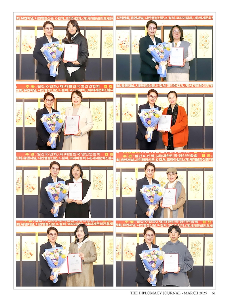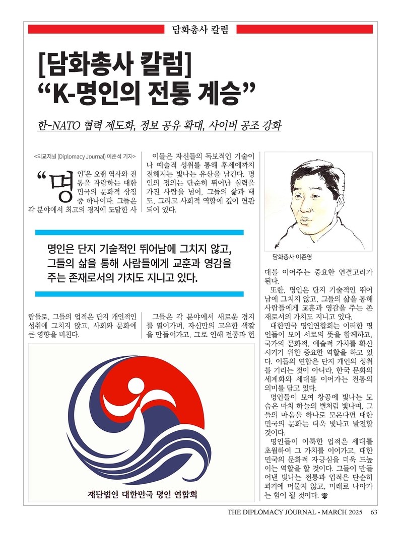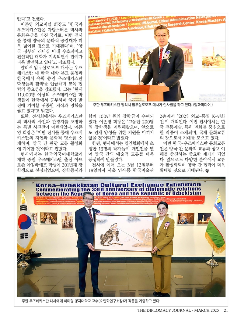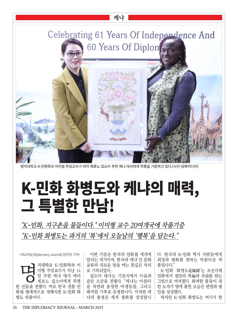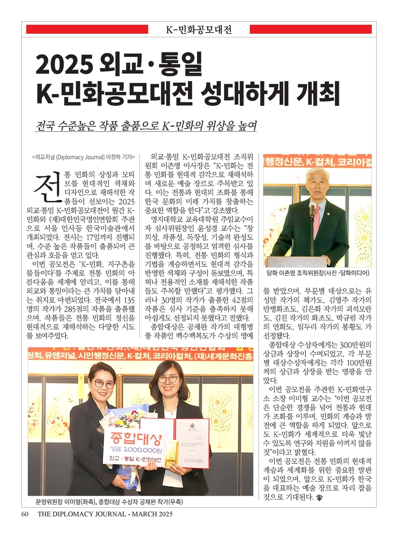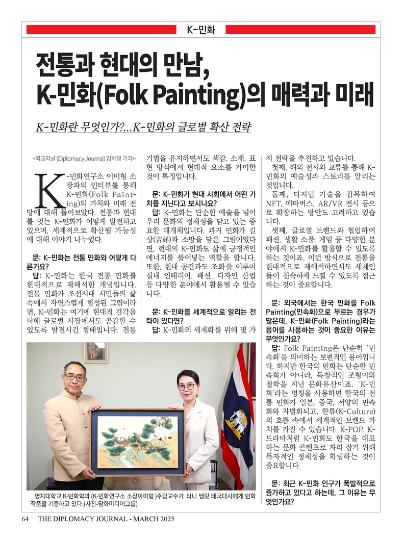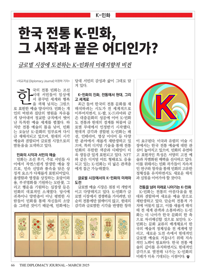 K-민화 이성준 기자 | 외교저널 창간 28주년...“외교와 문화 교류의 새로운 도약” 1996년 창간된 외교저널(Diplomacy Journal)이 창간 28주년을 맞이했습니다. 지난 28년 동안 외교저널은 국제 외교의 흐름을 기록하고, 국가 간 협력과 문화 교류를 촉진하는 데 앞장서 왔으며, 이제 글로벌 외교 저널로서 더욱 발전하고자 합니다.