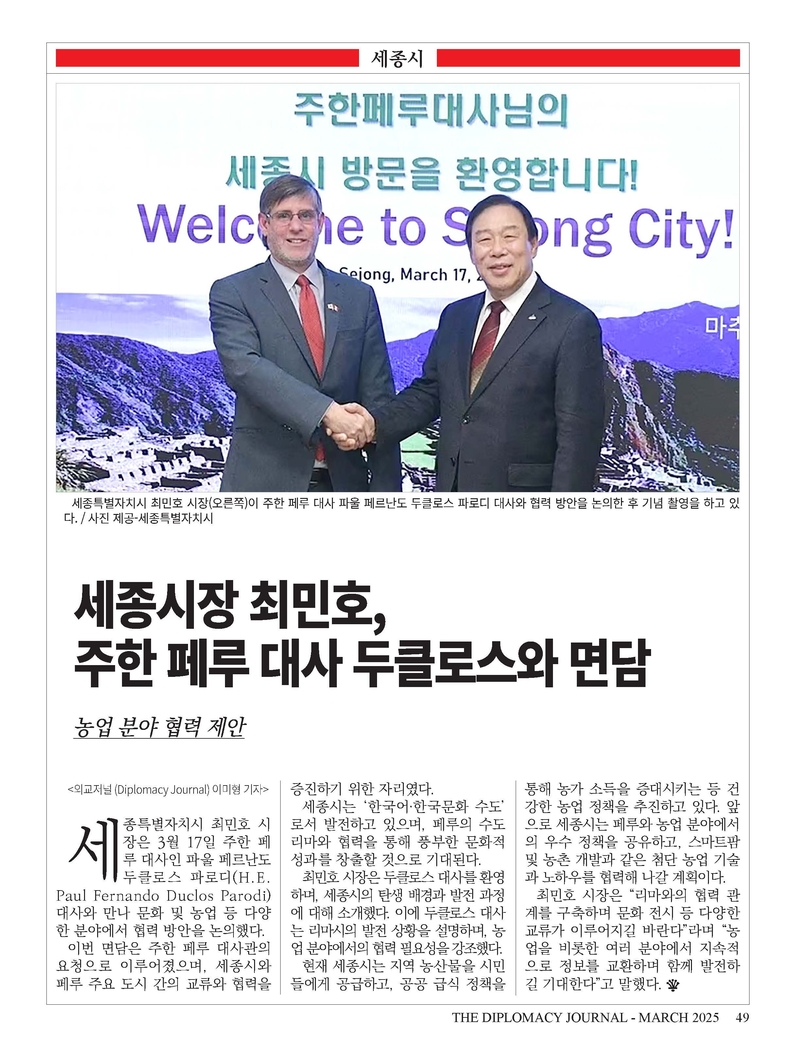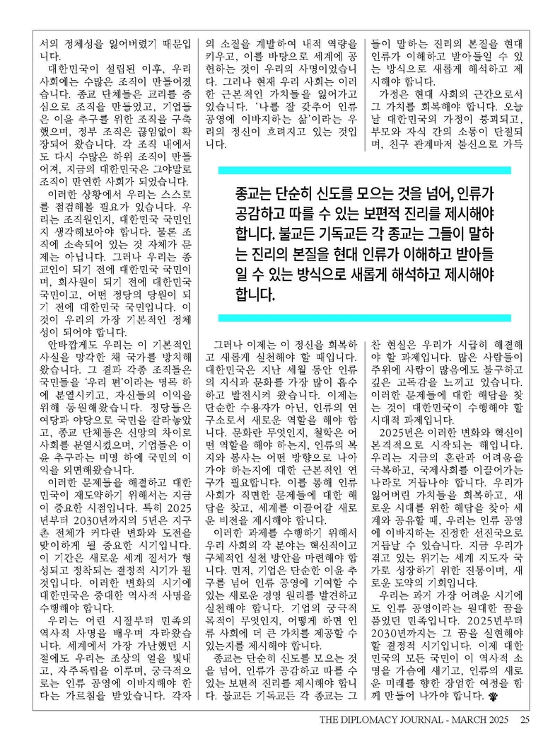 "외교저널은 지난 28년 동안 외교와 문화 교류의 가교 역할을 수행해 왔습니다. 앞으로도 단순한 뉴스 매체를 넘어 대한민국과 세계 각국을 연결하는 중요한 플랫폼으로 자리 잡겠습니다. 각국 외교관과 정책 입안자들의 목소리를 담아 국제 협력과 상호 이해를 증진하는 데 기여할 것이며, 독자 여러분과 함께 더욱 발전해 나가겠습니다. 창간 28주년을 맞이해 지금까지 저희를 응원해 주신 모든 분께 깊은 감사를 전합니다.“