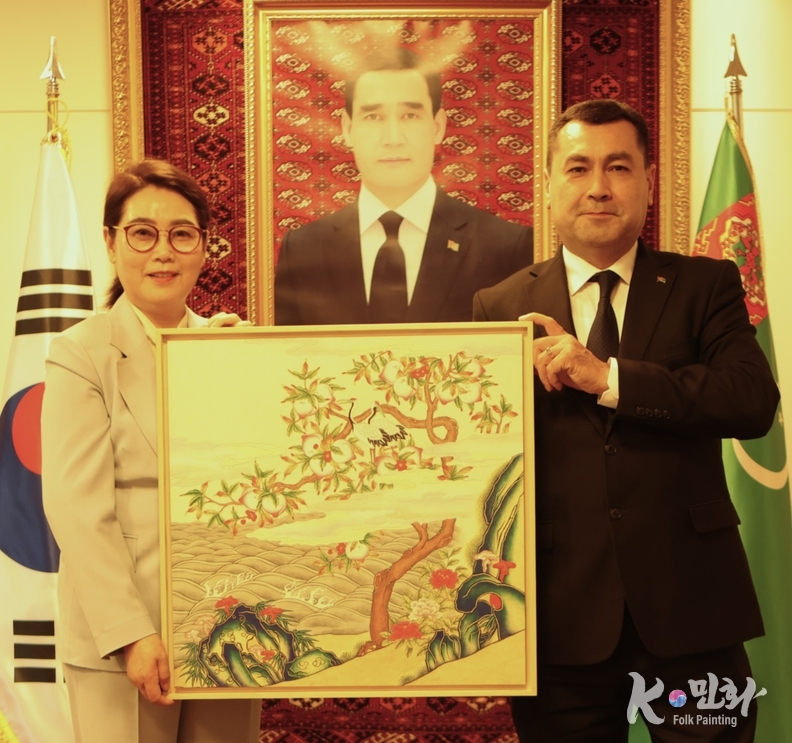 K-민화 이성준 기자 | 지난 12일, K-민화연구소 이미형 소장(명지대학교 K-민화학과 교수)은 서울 주한 트루크메니스탄 대사관을 공식 방문해, 오르자코프 아타도르디 주한 트루크메니스탄 대사에게 한국 전통 민화 작품(K-민화)을 기증했다.