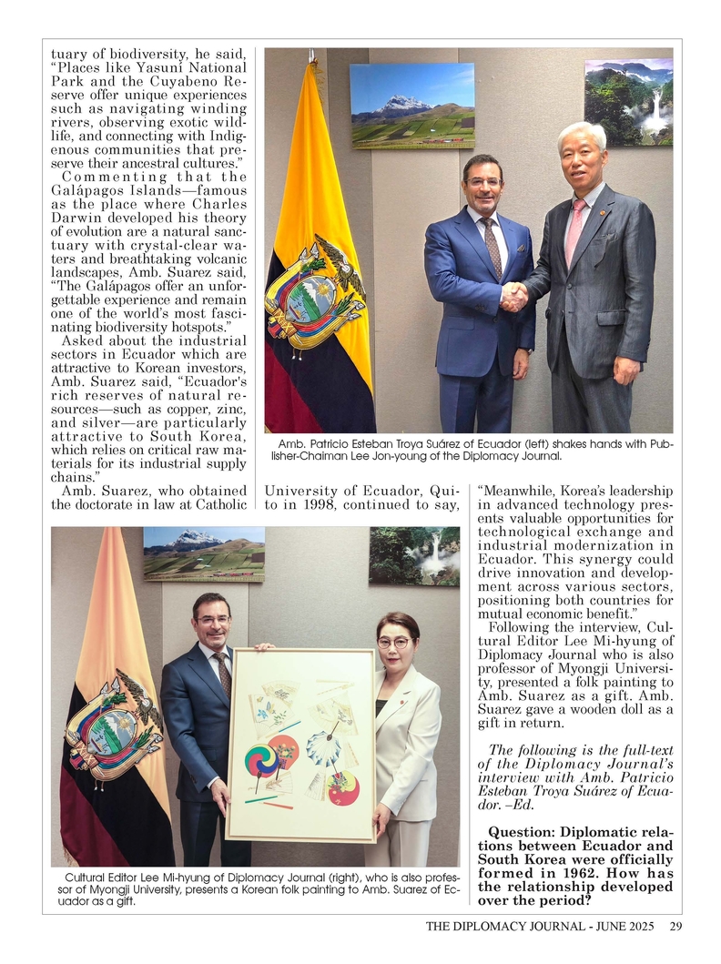 이에 화답해 트로야 수아레스 대사는 에콰도르 전통 수공예품인 나무 인형을 감사의 표시로 선물했다. 이 인형은 에콰도르의 토속 문화와 민속 예술의 정수를 담고 있어, 상호 문화 존중과 우정의 상징으로 의미를 더했다.