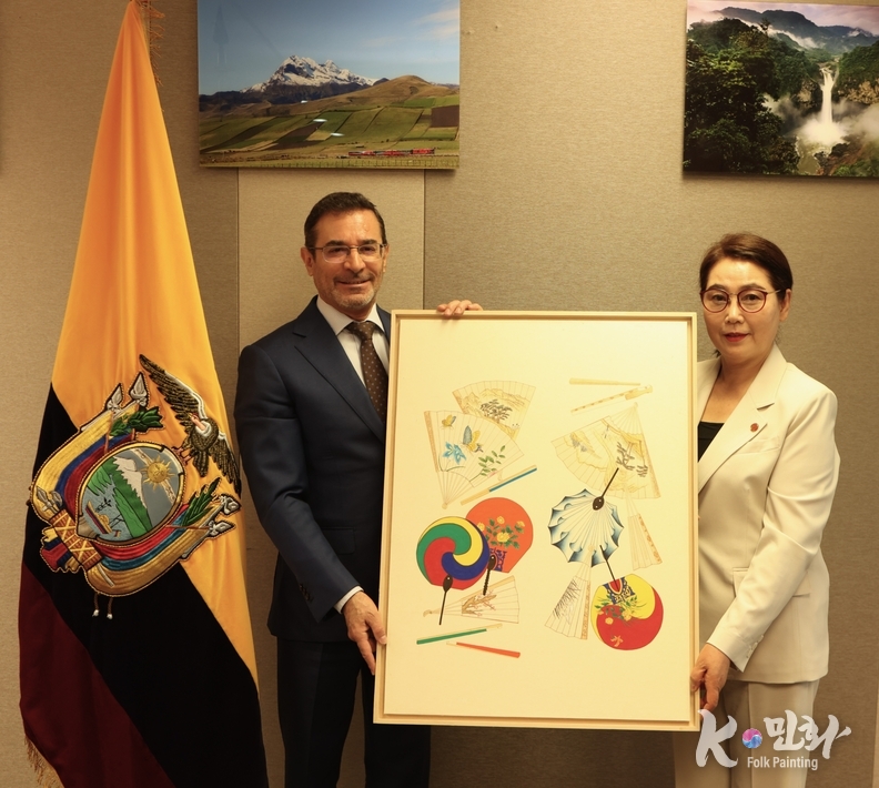 K-민화 이성준 기자 | 지난 23일 서울 주한 에콰도르 대사관에서 따뜻한 문화 교류의 장면이 펼쳐졌다. 이미형 명지대학교 k-민화 학과 교수은 빠트리시오 에스테반 트로야 수아레스(Patricio Esteban Troya Suárez) 주한 에콰도르 대사에게 한국 전통 민속화인 ‘K-민화’를 정성스럽게 담은 작품을 선물로 증정했다.