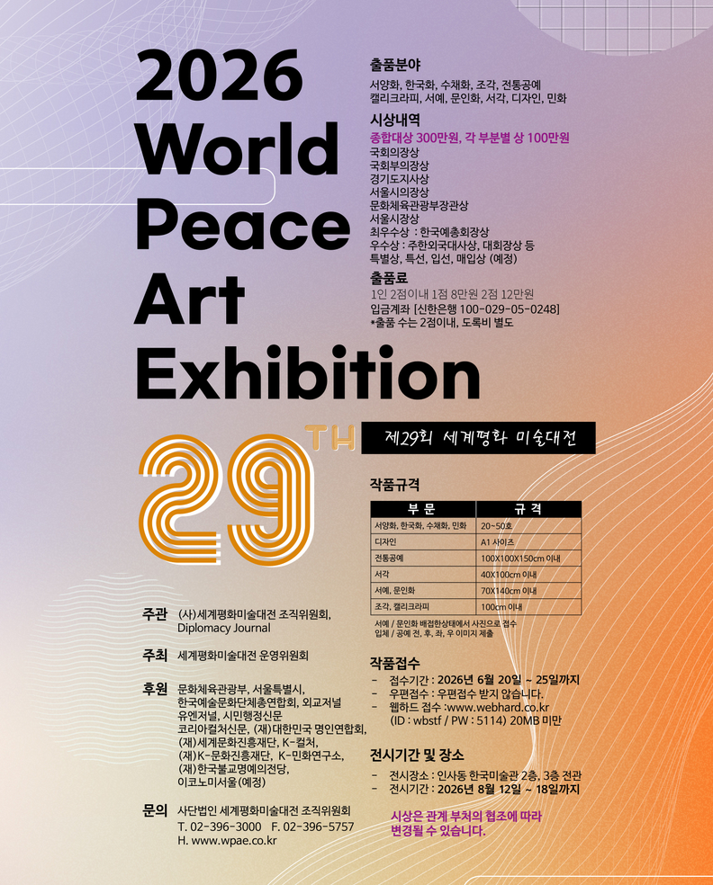2026년에는 제29회 세계평화미술대전이 더욱 풍성한 구성과 국제 교류로 돌아올 예정이다. 세계 각국의 작가들이 다시 한 번 예술로 하나 되는 무대를 만들 것을 예고하며, 제28회 대전은 평화와 예술의 아름다운 여운을 남긴 채 시상식이 마무리되었다.