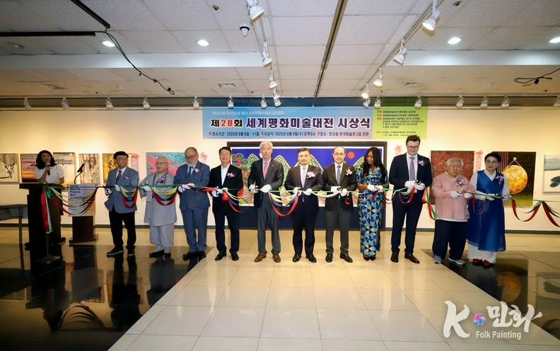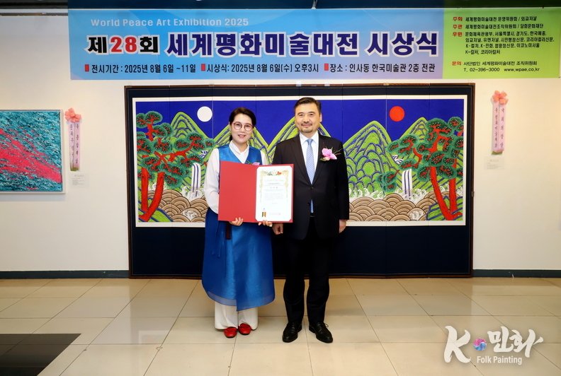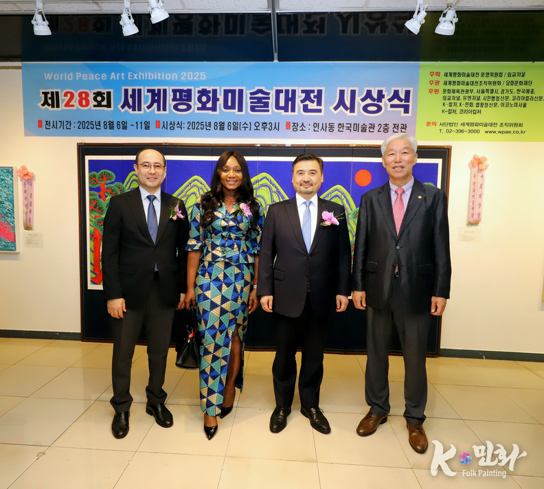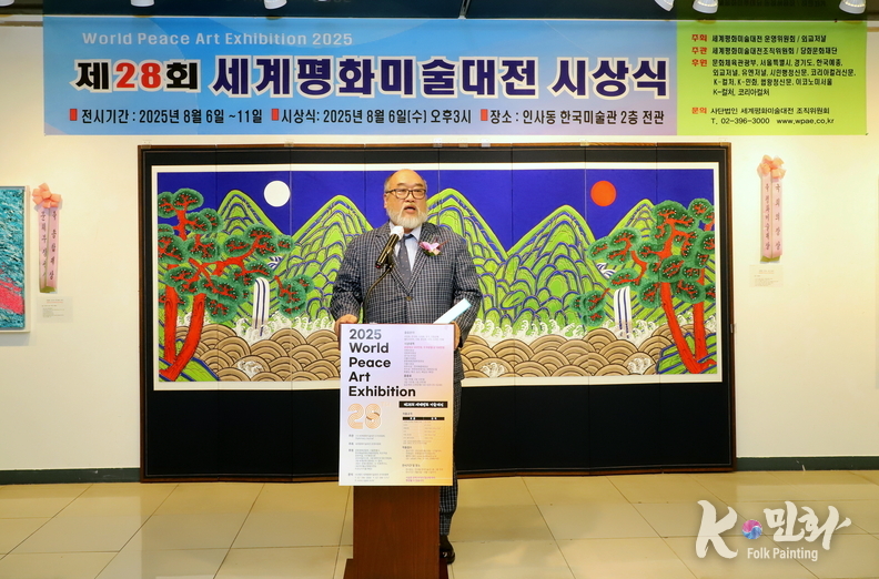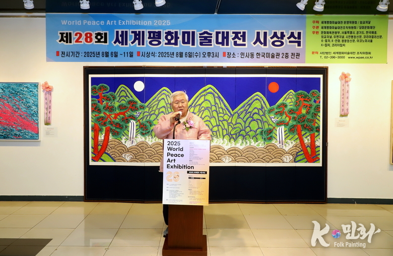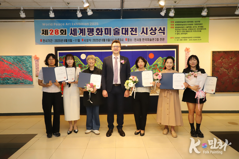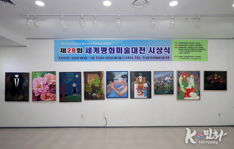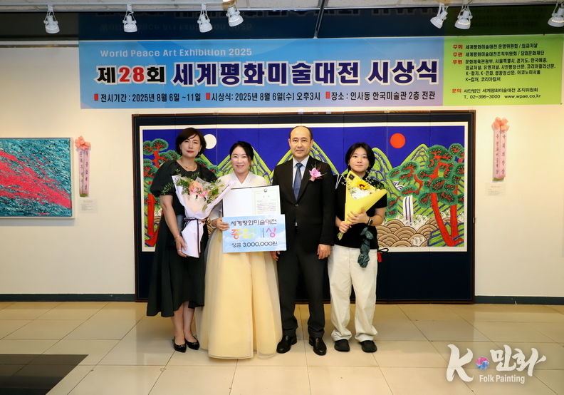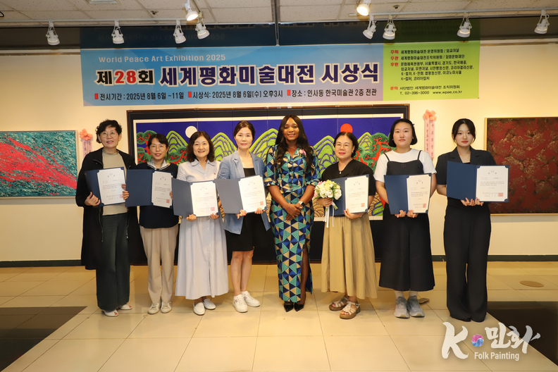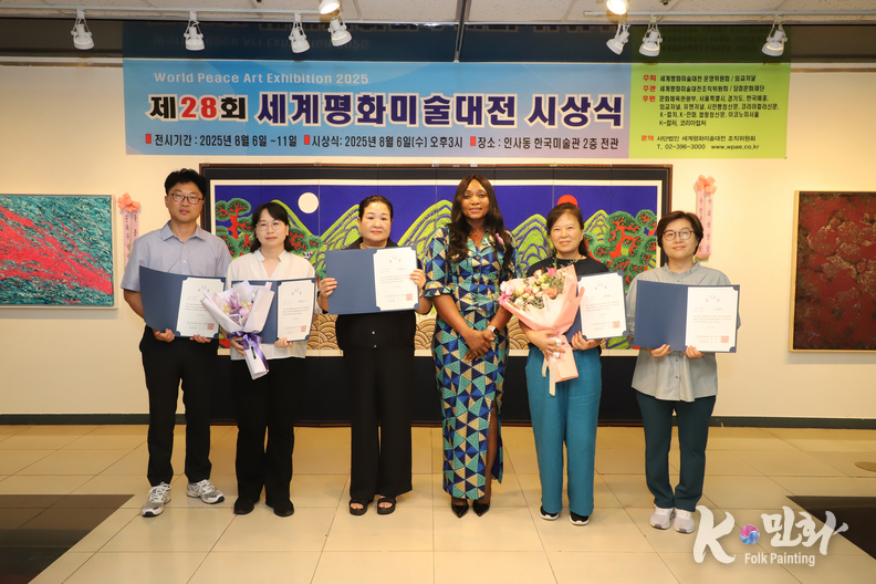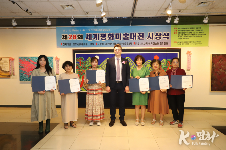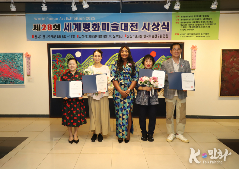 K-민화 이성준 기자 | 2025년 8월 6일 오후 3시, 서울 인사동 한국미술관에서 개최된 제28회 세계평화미술대전 시상식은 전 세계 21개국에서 620여 명의 예술가가 참여해 1,200여 점의 작품이 접수되었으며, 이 중 800여 점이 전시되었다. 시상식에는 200여 명의 내외 귀빈이 참석한 가운데 성황리에 마무리되었다.