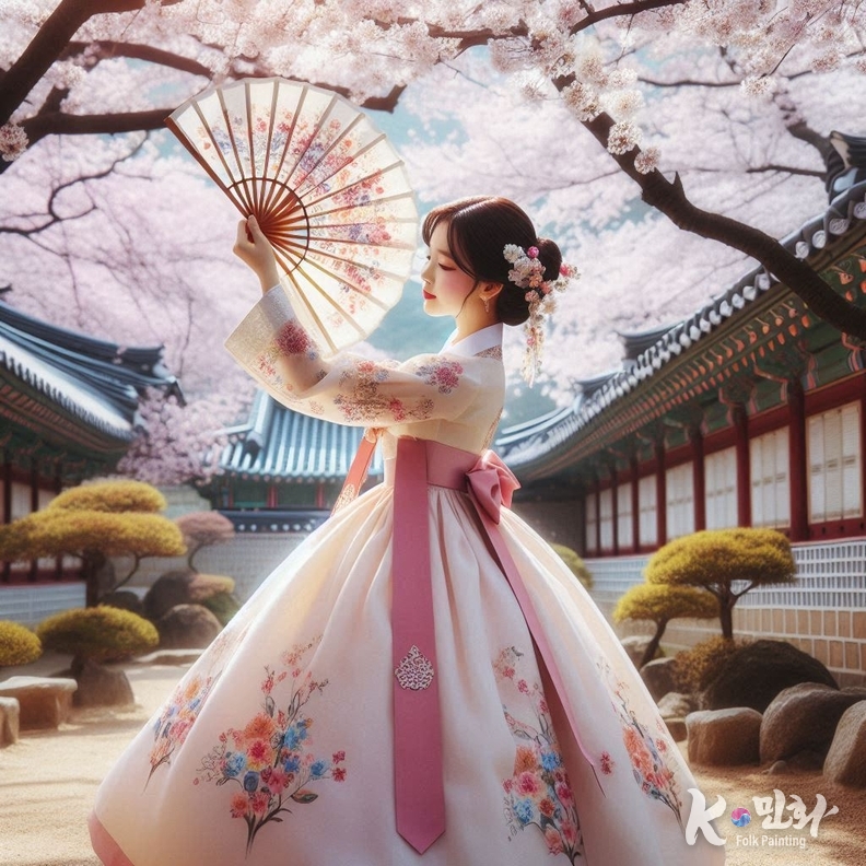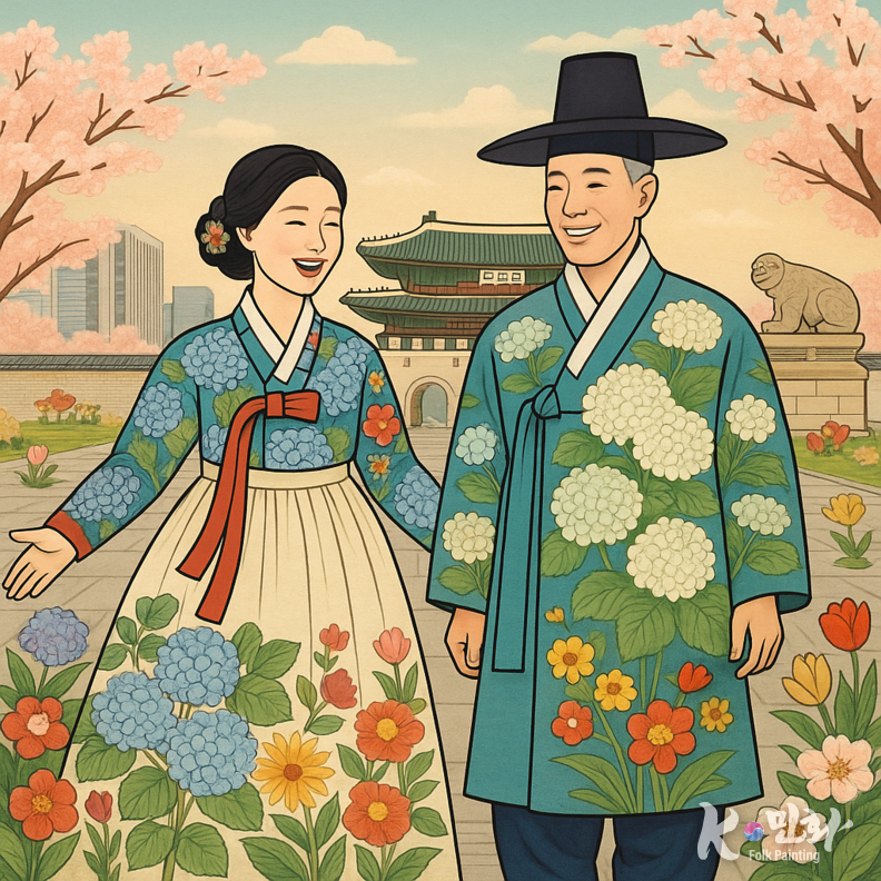 고궁의 전각 아래에서 빛나는 K-민화 한복은 전통과 현대가 만난 새로운 미학이다. 한복은 몸을 감싸고, 민화는 마음을 덮는다. 붓끝에 새겨진 상징들이 원단 위에 살아나면서, 한복은 단순한 의복이 아니라 움직이는 민화로 다시 태어난다.
