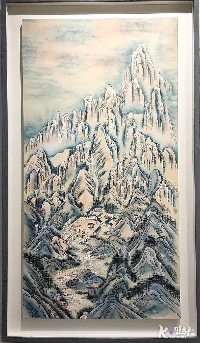 그녀의 작품 〈그리운 금강산〉은 한 폭의 그림을 넘어, 글씨와 회화, 영성과 서정이 어우러진 종합예술이다. 캘리그래피 작가로서의 경력을 바탕으로 붓의 필획과 운율을 민화의 구조 속에 녹여낸 그녀는, 산과 구름, 마을과 사찰을 글씨처럼 써 내려간다. 그의 붓끝에서는 산맥이 행서行書가 되고, 구름이 초서草書가 되며, 그리움이 한 편의 시로 피어난다.