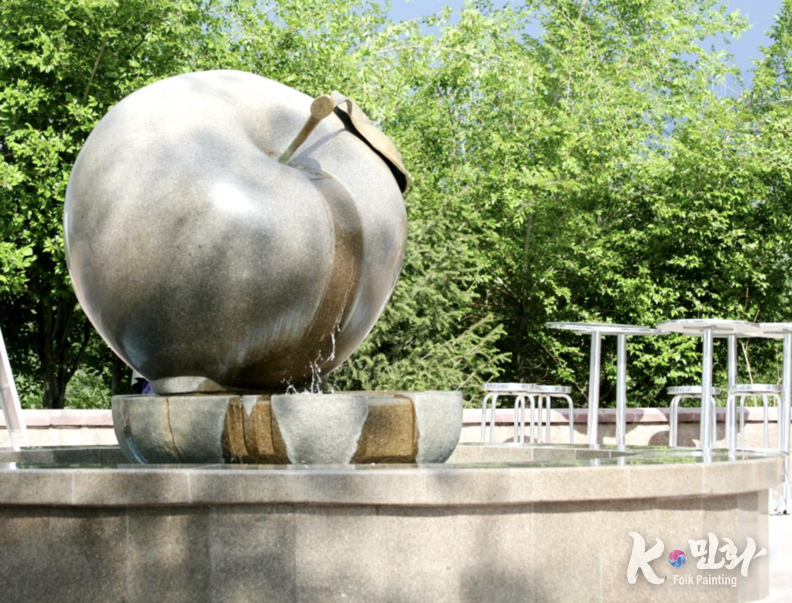 K-민화 이존영 기자 | 이 사진은 카자흐스탄 알마티(Almaty) 도심의 공원에 위치한 ‘황금 사과 분수(Apple Fountain)’를 담고 있습니다. 거대한 사과를 형상화한 이 분수는 도시의 이름인 ‘알마티(Almaty)’가 카자흐어로 ‘사과가 많은 곳’을 뜻한다는 데서 유래했습니다. 매끈한 화강암 재질로 조각된 사과 표면을 따라 물이 흘러내리며, 풍요와 자연의 조화를 상징합니다.