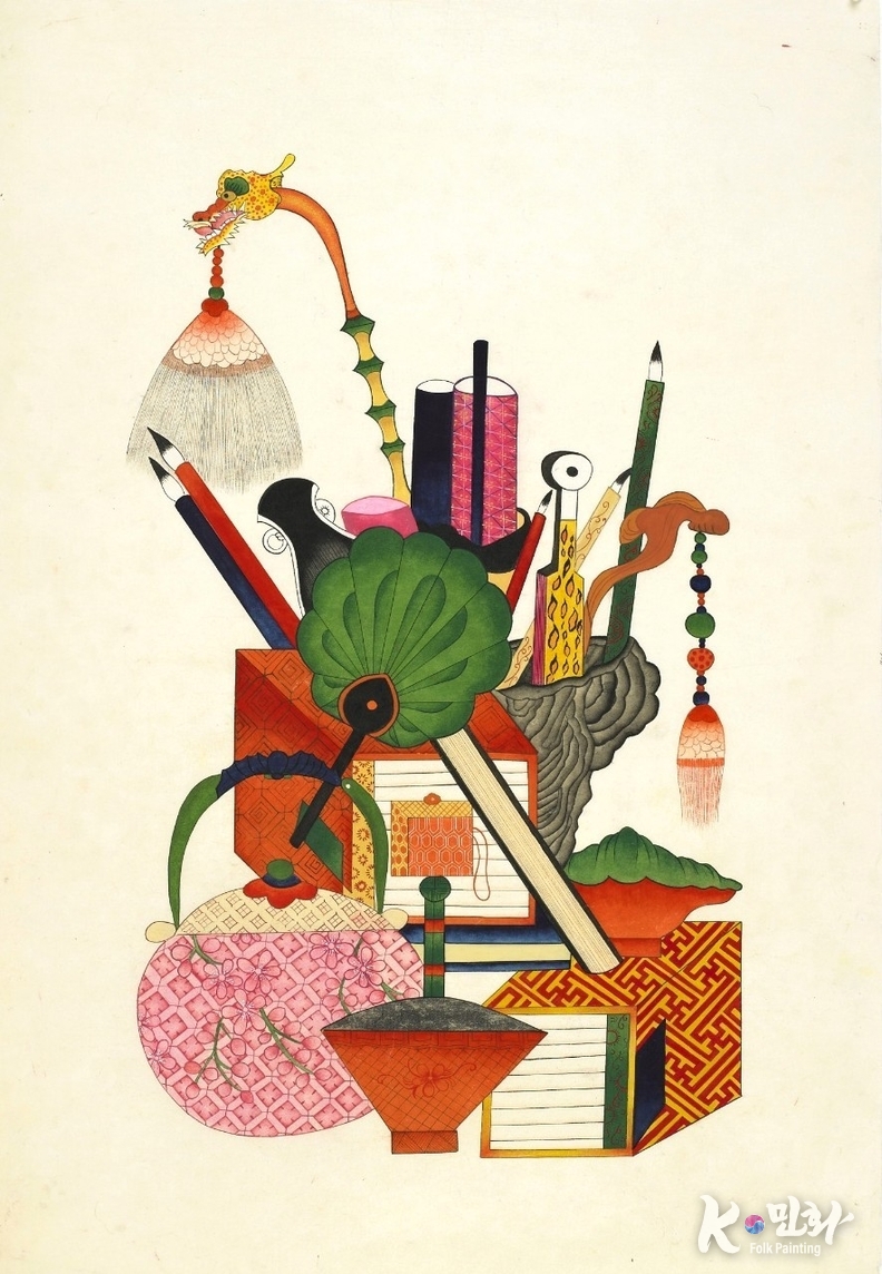 K-민화 김학영 기자 | 공재완 작가의 K-민화 〈책거리도〉(65×95cm)는 이러한 책거리의 고유한 미학을 현대적 감각으로 재해석한 작품으로, 전통과 창조성을 동시에 보여주는 수작秀作이다. 작품에는 문방사우, 향합, 부채, 두루마리 등 학문과 수양을 상징하는 오브제가 정갈하게 배치되어 있다.