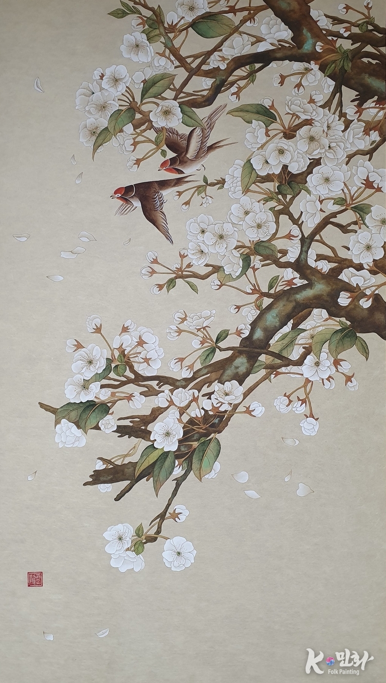 굵고 단단한 가지는 시간의 축적을 닮았고, 그 위에 피어난 꽃들은 기다림 끝에 도달한 결실처럼 보인다. 하얀 꽃잎이 바람에 흩날리는 장면은 덧없음이 아니라, 다시 피어날 것을 이미 알고 있는 존재의 여유다. 이는 민화 화조도가 지녀온 본래의 미덕이자 자연을 통해 삶을 위로하는 기능을 충실히 계승한 해석이다.