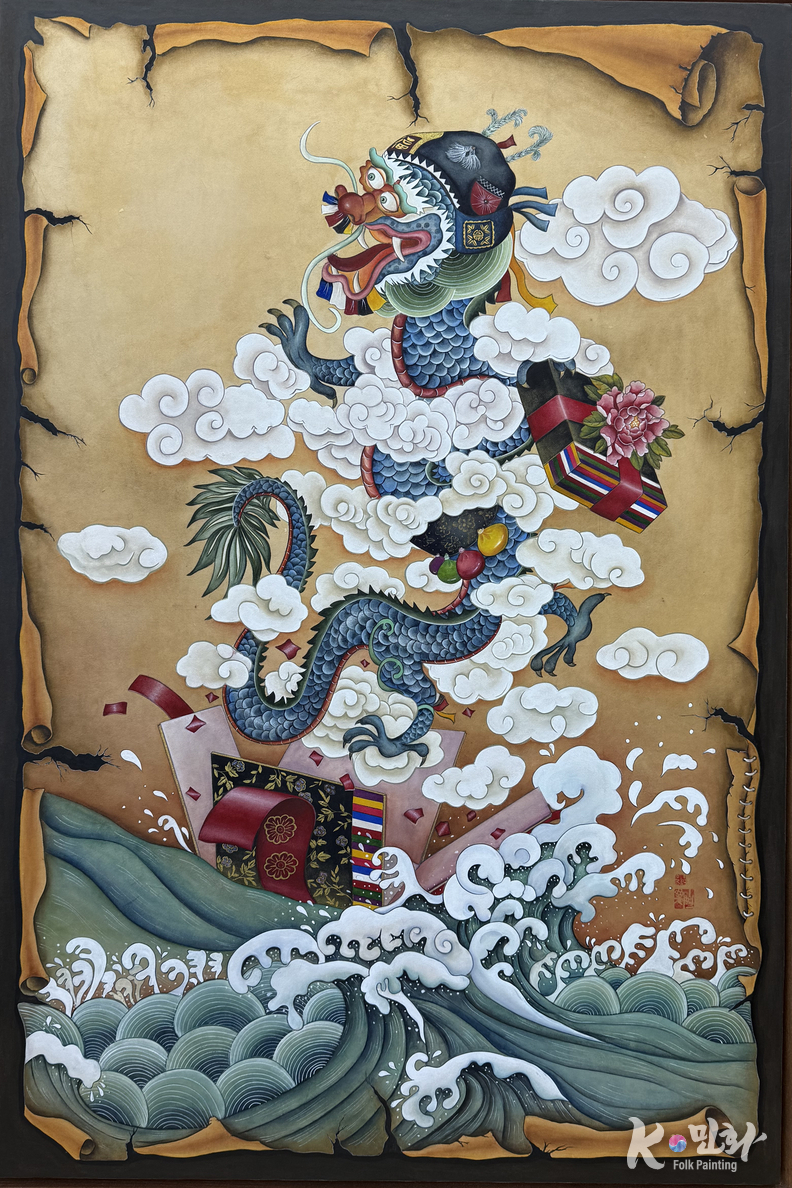 화면 중앙을 가로지르며 구름과 파도를 뚫고 오르는 청룡은 전통 민화에서 권위와 길상의 상징이지만, 이 작품에서의 용은 다르다. 군림하지 않고, 위협하지 않으며, 오히려 무언의 동반자처럼 파도를 건넌다.