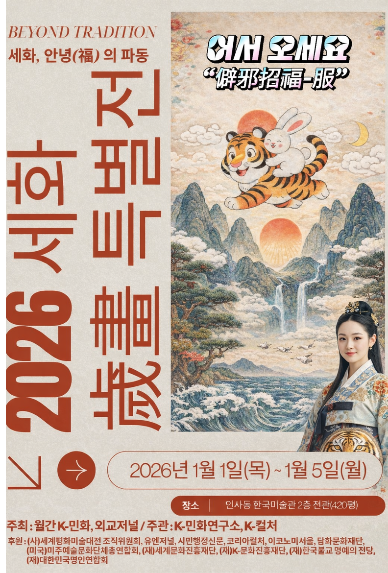 전통은 늘 질문을 받는다. “지금 이 시대에도 유효한가.” 그러나 더 정확한 질문은 이것이다. 전통은 어떻게 살아 움직이는가. 2026년 병오년 새해 첫날, 서울에서 개막하는 세화전歲畵展은 이 질문에 하나의 분명한 답을 내놓는다. 전통은 박물관에 보관될 때보다, 사람의 몸 위에서 살아 움직일 때 비로소 현재가 된다. K-민화와 민화한복이 만난 이번 세화전은, 한국 전통이 ‘보는 문화’를 넘어 ‘입는 문화’, ‘걷는 문화’, ‘세계로 향하는 문화’로 전환되는 상징적 장면이다.