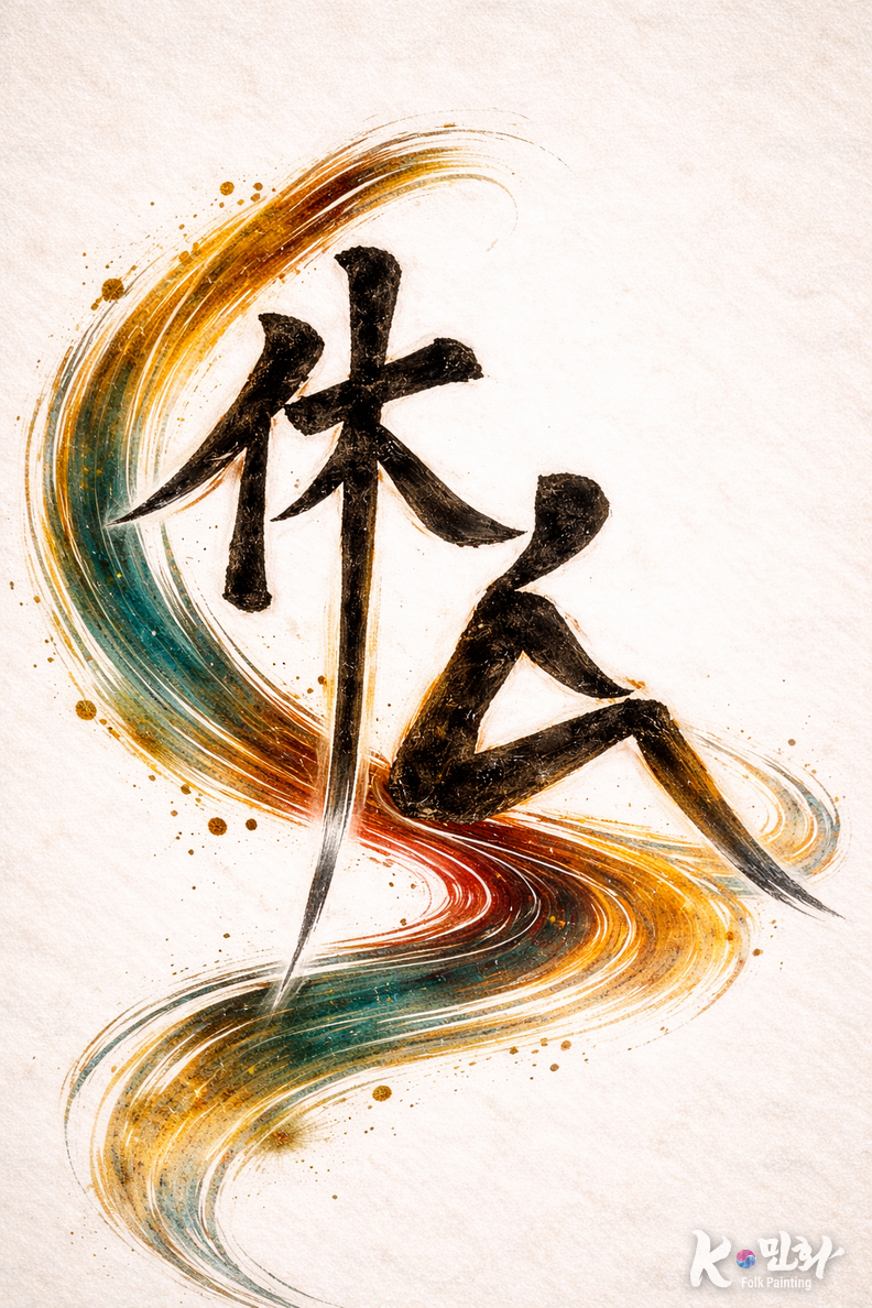 K-민화 김학영 기자 | 한자 ‘休’휴는 단순한 쉼의 기호가 아니다. 사람人이 나무木에 기대어 숨을 고르는 순간, 그 형상에는 삶의 리듬과 존재의 회복이 함께 담겨 있다. 이번 작품은 이 ‘休’의 의미를 문자 이전의 상태로 되돌려 놓는다. 글자는 해체되고, 획은 몸이 된다. ‘人’은 더 이상 읽히는 대상이 아니라 서 있는 존재가 되고, ‘木’은 배경이 아니라 세계를 지탱하는 축으로 작동한다.