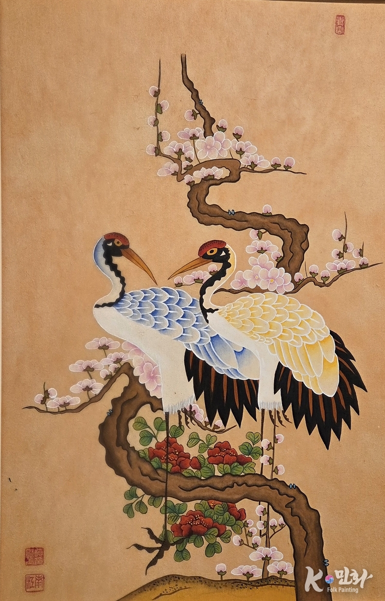 색채 또한 절제되어 있다. 학의 깃털은 청·백·황의 미묘한 층위로 겹쳐지고, 배경은 과하지 않은 황토빛으로 화면 전체를 감싼다. 이 색의 선택은 봄을 축제처럼 소비하지 않고, 시간의 흐름으로 받아들이는 태도에 가깝다. 민화 특유의 장식성보다, 자연을 바라보는 시선의 깊이가 먼저 느껴진다.