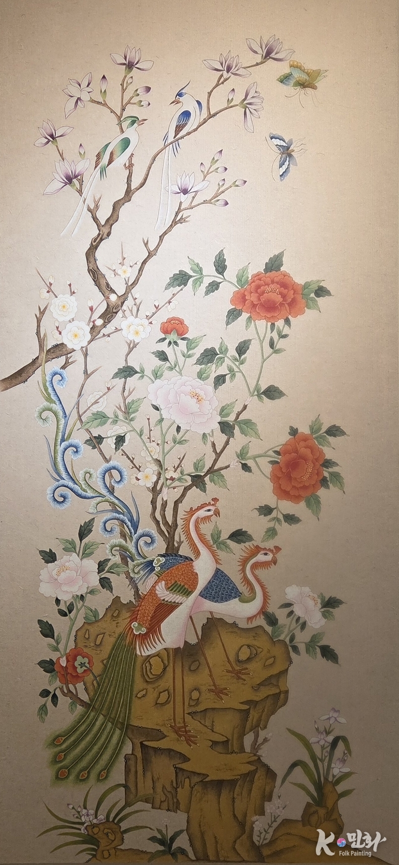 봉황의 깃털은 특히 인상적이다. 녹청과 주홍, 백색과 금빛이 겹겹이 쌓였지만 과장되지 않는다. 이는 기술의 과시가 아니라, 오랜 수행 끝에 도달한 색의 태도다. 색은 서로 경쟁하지 않고, 형태는 질서를 잃지 않는다. k-민화의 본령이 보는 이를 편안하게 하는 힘’이 여기서 또렷이 살아난다.