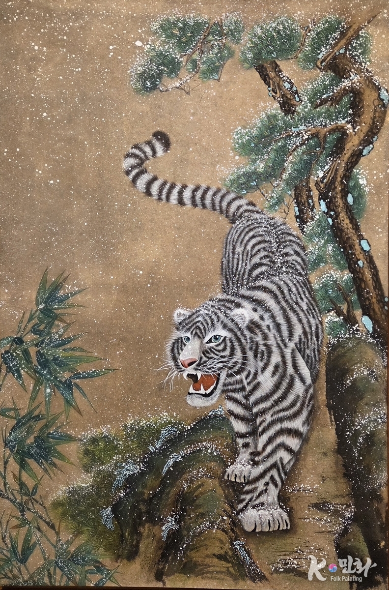 K-민화 이성준 기자 | 호랑이는 언제나 강하다. 그러나 박현정 작가의 '송죽설호'가 보여주는 강함은 포효의 크기가 아니라 버티는 태도에서 비롯된다. 눈발이 흩날리는 설경 속, 송죽 사이를 가르며 내려오는 이 설호雪虎는 위협보다 결기를 먼저 드러낸다.