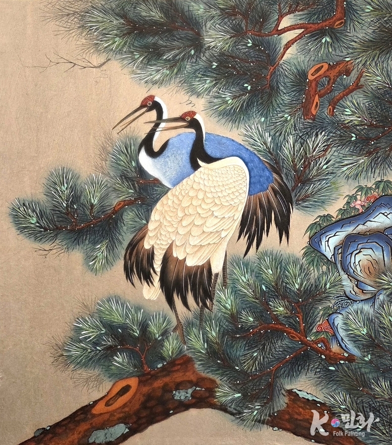 작품 속 소나무는 요란하지 않다. 굵은 줄기와 촘촘한 솔잎은 바람을 과시하지 않고, 학은 날갯짓을 멈춘 채 가지 위에 서 있다. 이 정적은 멈춤이 아니라 지속이다. 민화가 말해온 이상은 언제나 여기 있었다. 크게 외치지 않고, 오래 남는 것.