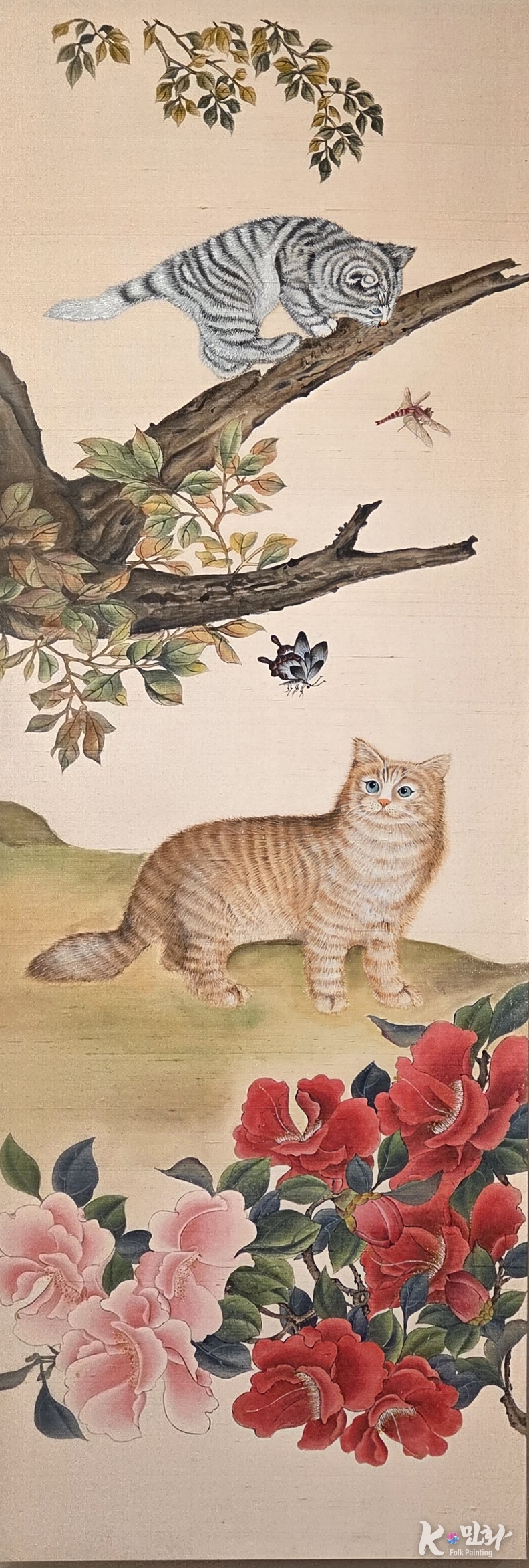 나비와 잠자리는 움직임의 신호다. 공중을 가르는 작은 생명은 화면에 긴장을 불어넣고, 고양이의 시선은 그 긴장을 따라 미세하게 흔들린다. 이때 고양이는 사냥꾼이기 이전에 관찰자가 된다. 급하지 않고, 소리 없이. 안경화 작가는 이 느린 호흡으로 k-민화의 미학을 오늘의 감각에 맞춰 낮춘다.
