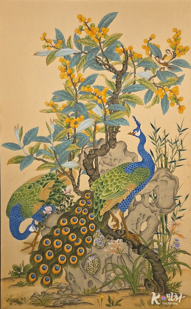 K-민화 이존영 기자 | k-민화에서 공작은 부귀와 영화의 상징으로 알려져 있다. 그러나 한현숙 작가의 '비파공작'은 이 익숙한 상징을 한 단계 낮은 음역으로 끌어내린다. 이 작품에서 공작은 화려하지만 요란하지 않고, 눈부시지만 스스로를 드러내려 애쓰지 않는다. k-민화가 지켜온 절제의 미학이 이 작품의 화면에서 또렷이 드러난다.