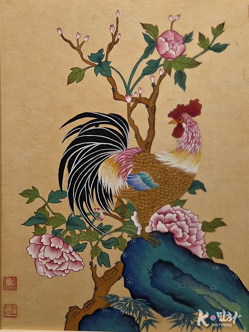 K-민화 이존영 기자 | k-민화에서 닭은 단순한 가축이 아니다. 어둠을 가장 먼저 깨우는 존재, 때를 아는 자이며, 공명功名의 문 앞에서 스스로를 단련한 상징이다. 전창순 작가의 '공명도'는 이 오래된 상징을 오늘의 시선으로 또렷하게 되살린다.